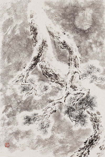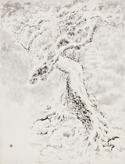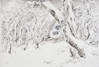과거에는 한지를 여러 형태로 변형시킨 후, 꼴라쥬하고 그 위에 그림을 그리는 등, 전통 재료를 응용한 실험을 많이 시도했습니다. 이는 소위 동양화, 한국화의 기법적 한계를 극복하고자 노력했던 부분이었습니다. 그러나 지금에 와서는 눈에 띄고 자극적인 실험 기법 보다는 초심으로 돌아가 동양화 본연이 가지고 있는 담담한 매력을 추구하게 되었습니다. 먼 길을 돌아온 것 같지만, 먹과 물, 붓과 종이가 상응하여 이루어 내는 당연하고도 무궁무진한 변화의 세계를 만끽하며 명상하는 자세로 대상을 표현하고 있습니다. 특히 눈 풍경을 표현하기 위해서 동양화 특유의 기법인 "홍운탁월(洪雲托月)"법을 쓰고 있는데요, 이는 "구름을 물들임으로써 달을 나타낸다"는 뜻으로, 그리지 않은 여백 부분이 눈(雪) 표현이 되어 맑은 느낌으로 화면을 꽉 차게 만드는 기법입니다.