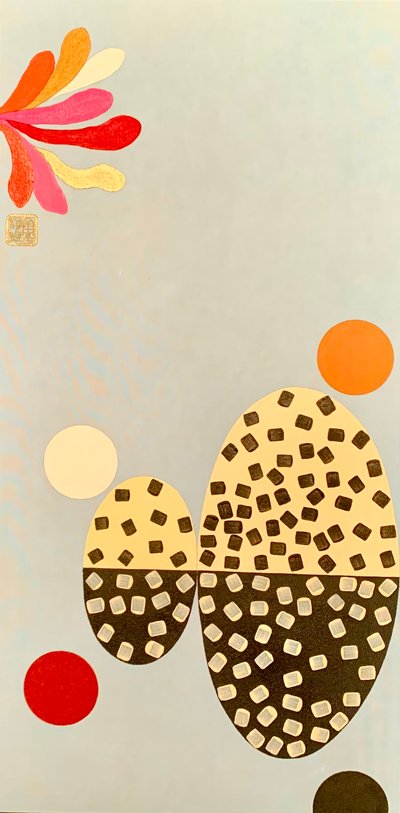 그 염색된 실크 위에 3년 이상 삭힌 풀을 발라 한지 위에 고르게 펴서 붙이는 장인의 "배접" 작업을 거치고, 그 배접된 실크로 나만의 캔버스를 만들고, 그 위에 오방색과 오간색을 활용하여 표현합니다.