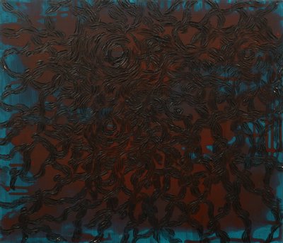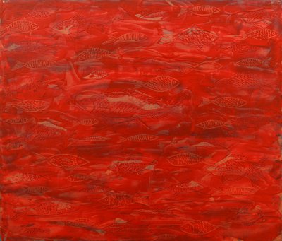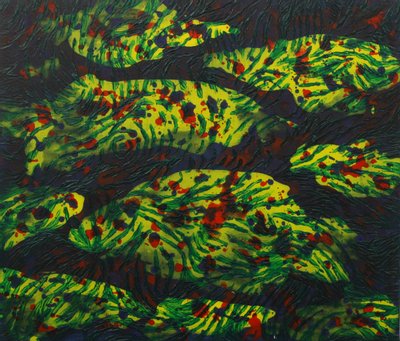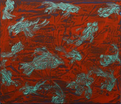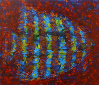 한동안 수족관을 집에 둔 적이 있는데, 이를 멍하니 보면서 일렁이는 수족관 속을 그림으로 그린 작품이 있는데, 단순한 재현이 아니라 시간의 흐름을 작품에 담으려 한 작품이 있습니다. 우선 바탕을 빗살무늬로 마티에르를 주고 그 위에 레이어로 사물과 공간을 그렸습니다. 의도치 않게 보는 방향에 따라 착시를 일으키는 부분이 재미있었던 작품이 있습니다.
