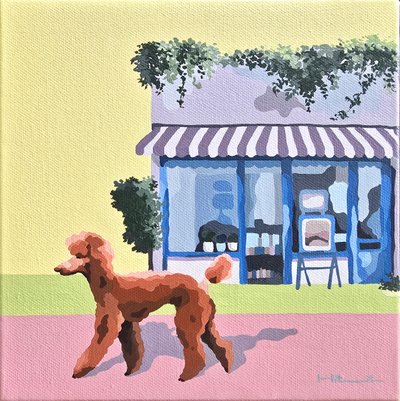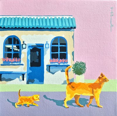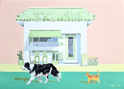 ‘인생은 가까이 보면 비극이고 멀리서 보면 희극이다’라는 말처럼 모든 것은 시점에 따라 달리 볼 수 있습니다. 게임 룰에 따라 움직이는 경기장의 함성이나 일터가 모여 있는 빌딩숲은 소리 없이 조용하지만 전쟁터 같습니다. 이런 곳들을 평화로운 하늘에서 내려 보게 된다면 어떻게 보일까란 단순한 호기심에서 출발했습니다. 도시는 크고 복잡하며 바삐 돌아가는 곳이지만 항공뷰로 보게 되면 다른 세상처럼 작고 질서정연하면서 평화롭고 예술적이기까지 합니다. 가끔 멀리 떨어져서 바라보는 관망의 자세와 여유를 가져보는 것이 어떨까요? 힘든 일도 지나고 보면 추억이 되듯이 말이죠. 희극과 비극의 차이는 결국 눈이 가는 시선과 관점의 차이에서 파생된다고 생각합니다. 시선에 의해 사고의 변화되는 관점을 화폭에 담고 싶었습니다. ‘보다’라는 행위, 피할 수 없는 많은 시선들에 대해. 하지만 너무 무겁지 않고 유쾌하게 표현하고 싶어 관객을 바라보는 귀여운 동물들을 주인공으로 내세웠습니다. 동물들의 사랑스러움과 자조적 관망 시점, 배경의 숨은 의미를 찾는 재미있는 작업이었습니다. 그림 배경은 지구의 한 지점을 내려다보는 시선, 동물들이 세상을 호기심 있게 보는 정면의 시선, 사람이 그림을 바라보는 시선 세 가지 시선들이 존재합니다. 횡단보도는 다른 대상과의 거리를 연결해주고 시작과 끝의 유기적 연결고리입니다. 인간과 동물의 관계, 풍경과 현상들을 주의 깊게 보았으면 하는 소망을 발랄하게 담았습니다.
