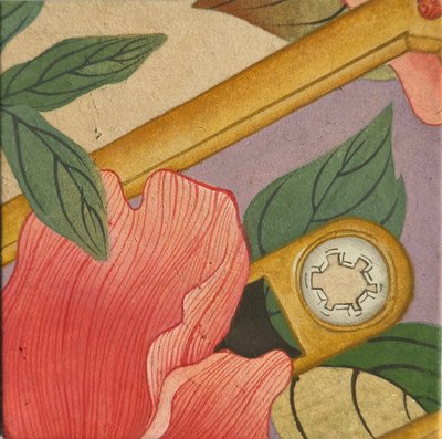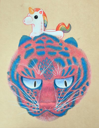 한국화에서 주로 사용하는 진채 기법으로 색을 진하게 올리는 방식을 채택하고 있습니다. 작품의 대상들은 색면으로 단순히 표현하기보다는, 여러 번 색을 덧칠하고 번지게 하는 '바림' 기법을 활용하여 자연스러운 색 변화를 추구합니다. 채도와 명도가 높은 다양한 색을 사용하여 작품에 경쾌함을 더하고자 했습니다.