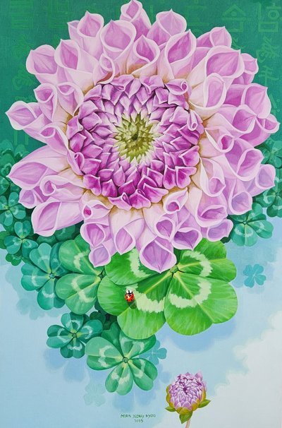 전통미학에서는 꽃을 정면에서 보는 것에 익숙하지만 작가는 꽃을 위에서 보는 시점으로 전환하였는데, 그것은 세상을 넓고 크게 보자는 메시지이다.
