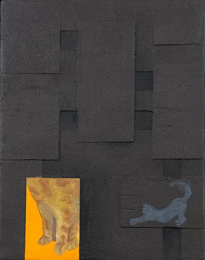 테라코트 라느 재료를 사용해서 캔버스위에 딱딱한 도시를 표현하고자 했고 그 속에서 살아가는 인간상을 고양이라는 대상으로 대신했다 고양이의 움직임 눈빛 등으로' 고립과 해방'이라는 주재로 작업하고 있다