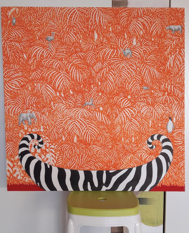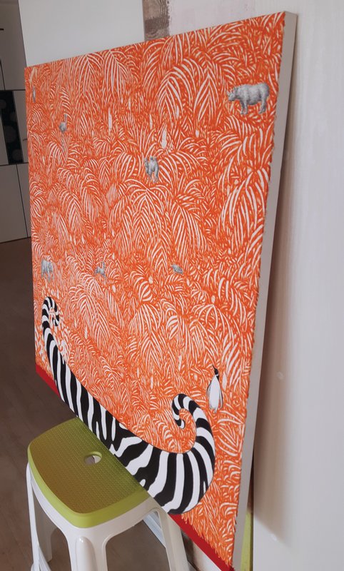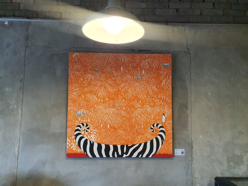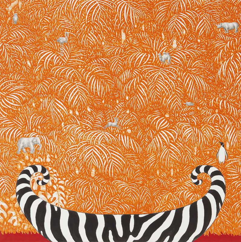 이용석 작가의 트레이드마크인 주묵이라는 재료에는 재미있는 고사가 얽혀 있습니다. 바로 중국의 대시인 소동파가 먹이 떨어져 주묵으로 대나무 숲을 그리게 되었는데 그 그림이 주인을 큰 부자로 만들어주었다는 이야기입니다. 이에 따라 붉은 대나무 숲 그림은 복을 가져다준다는 믿음이 전해져 내려오고 있는데요. ‘세상에 붉은 대나무 숲이 어디 있느냐?’는 말에 ‘그럼 검은 대나무 숲은 있느냐?’고 당당하게 대답하던 소동파의 재치와 상상력은 이용석 작가의 작품에서도 전해집니다. 평소에는 보기 힘든 동물들이 한데 모여 있는 이 그림을 바라보다 보면 마치 꿈꾸는 듯이 그 안으로 들어가 보고 싶어지는데요. 환상적인 색감과 상징성이 풍부한 요소들로 가득 찬 이 그림이 누군가에게는 위로가, 누군가에게는 행운의 상징이 될 것입니다. 어디든지 이 그림이 걸려 있는 곳에서는 그림에 얽힌 이야기로 이야기꽃이 피게 될 것 같네요.