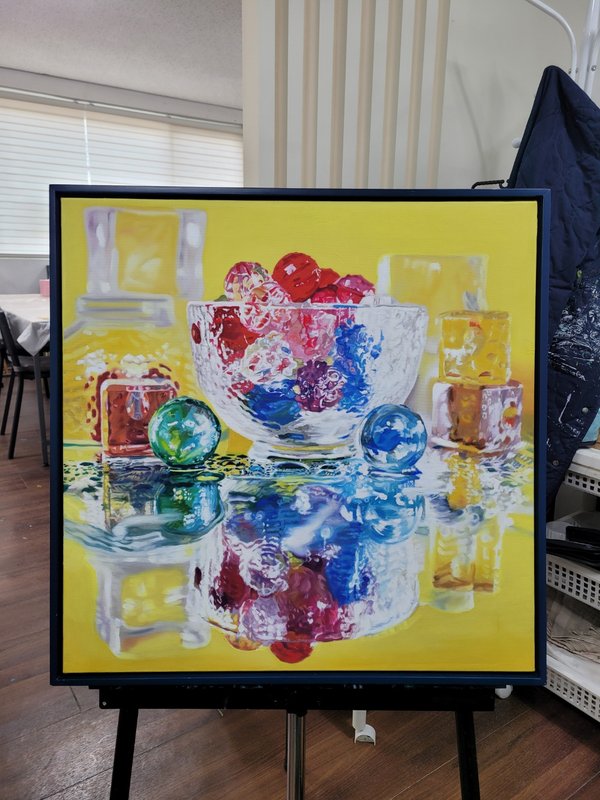 다채로운 빛과 색채들이 펼쳐져 있습니다. 노재림 작가는 작품의 주제로서 ‘굴절’을 다루고 있습니다. 굴절이란 빛의 반사로 이루어진 추상 형태의 굴절, 거울에 비친 대칭된 반영의 모습, 그리고 물의 결정체가 만들어낸 물방울들이라고 할 수 있습니다. 작가는 작품 속에서 형성된 추상 형태의 굴절을 통해 자가 모습을 투영함으로 자신의 자아정체성을 찾고, 구슬에서 느껴지는 투명성을 상징함으로써 현실 사회에서의 투명성과 깨끗함, 마음속 정화를 담았다고 합니다. 무엇보다 현실 속에서 치열하게 사는 이들에게 이 작품을 통해 정서적 안락함과 쉼을 전달하고자 하는데요. 추상적 빛에 의한 굴절 형상과 빛의 반사를 통해 희망적이고 긍정적인 메시지를, 투명성을 통해 삶에서의 희망적인 미래를 부여하고 싶다고 말합니다.