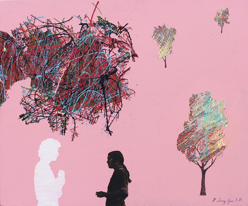 박정선 작가의 작품 속에는 다양한 요소들이 독특한 조화와 구도감으로 놓여 있습니다. 욕망의 철학자 자크 라캉의 말에 따르면 무의식은 의식 밑바닥에서 작용하는 욕망의 질서로, 인간은 이 욕망을 무의식적으로 실행한다고 합니다. 박정선 작가는 인간의 욕망을 탐구하고, 의식과 무의식 그 경계에 있는 상징적 표상을 화면 위에 구현하는데, 그것은 무의식이 상징과 은유를 통해서만 드러나기 때문입니다. 작가의 작품은 이러한 상징과 은유를 담은 요소들의 독특한 화면 구성을 통해 일종의 무의식적이고도 초현실적인 장면을 연출하는 듯 보입니다.