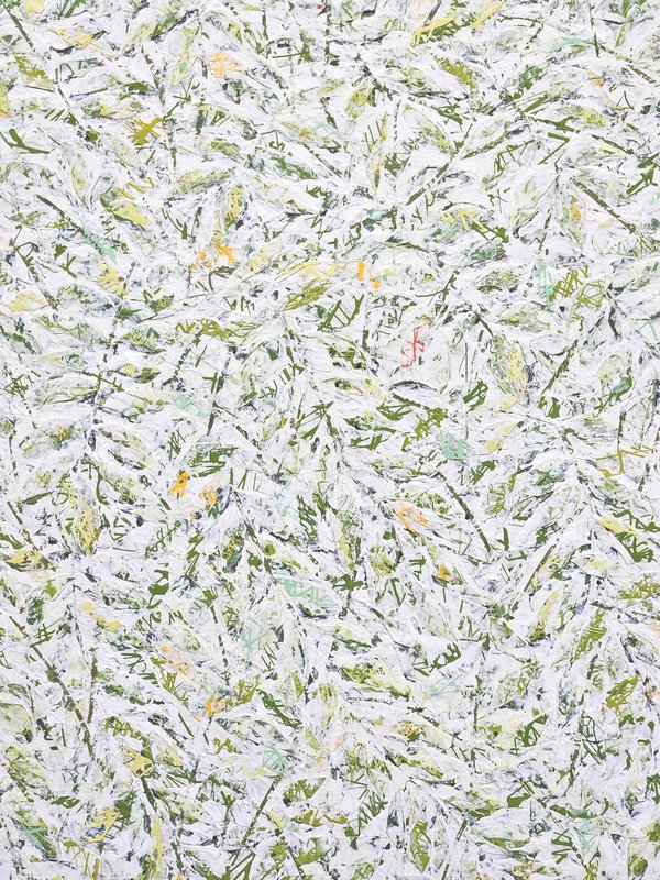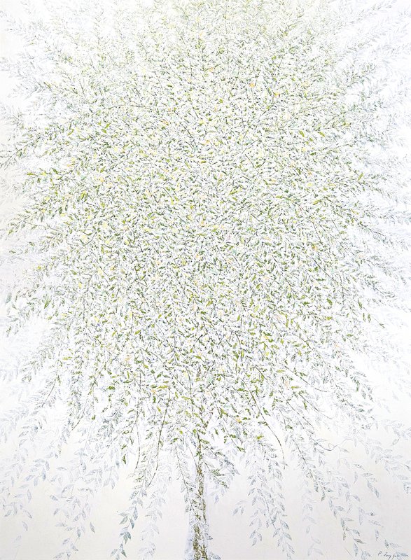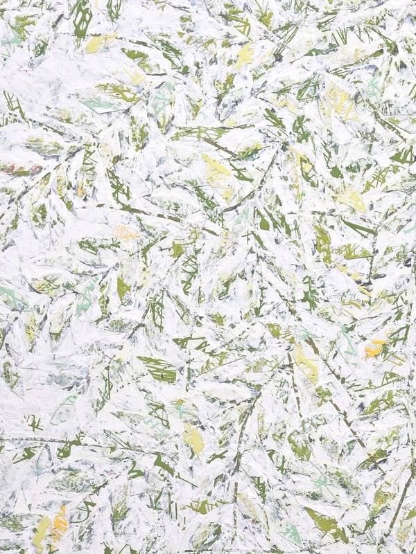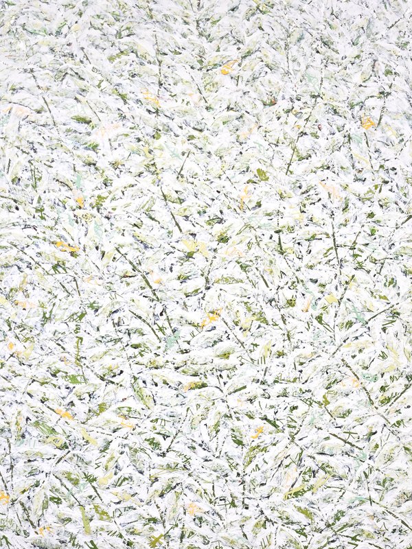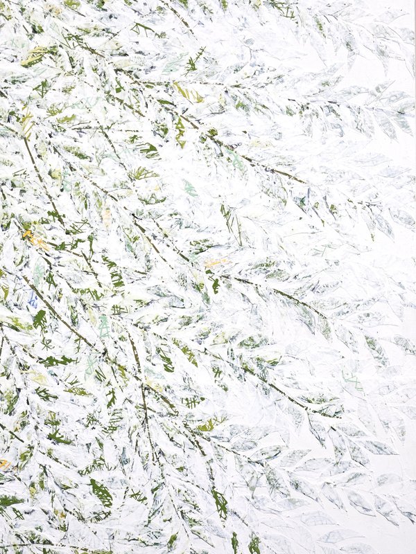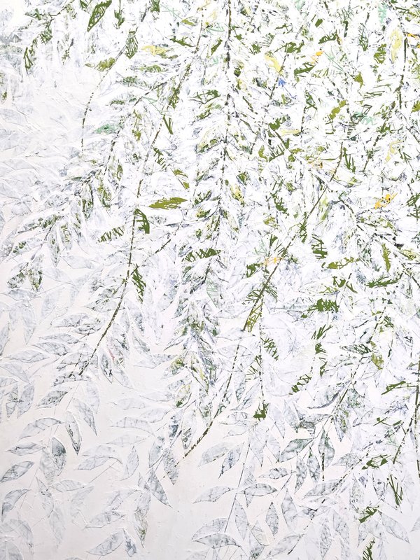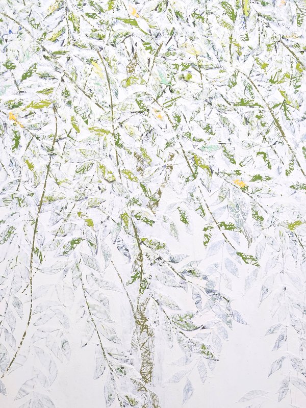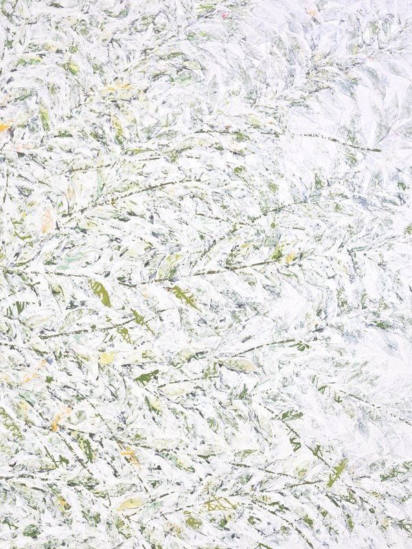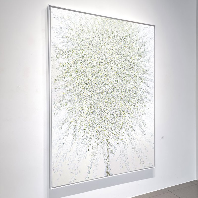 숲속에 투박하게 피어있는 듯한 꽃들이 표현되어 있습니다. 화려하거나 뚜렷한 형상을 하기보다는 빈티지하면서도 쓸쓸하고, 빽빽하면서도 듬성하게 보이죠. 박정선 작가는 주로 의식과 무의식 그 경계에 있는 상징적 표상을 화면 위에 구현합니다. 이 작품에서는 숲의 잔상들을 통해 익숙하고도 낯선 구성과 대상으로 감상자에게 다가가고 있습니다. 건조하고 자유로운 선과 물감 드리핑으로 이루어진 작가만의 표현법으로 완성된 특유의 몽환적인 분위기를 느껴보시기를 바랍니다.