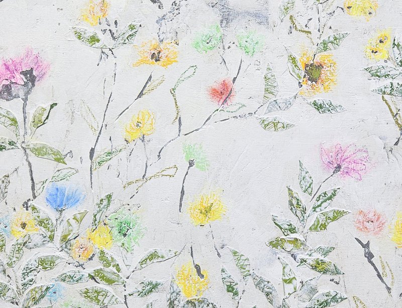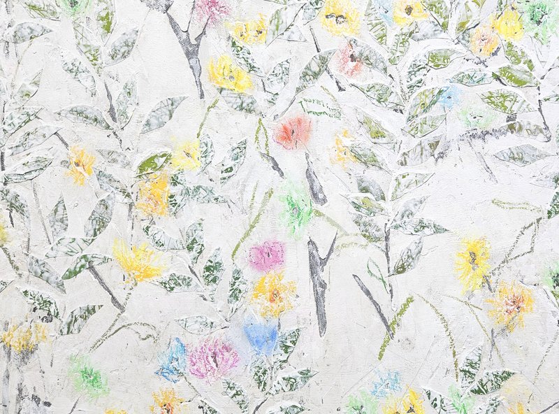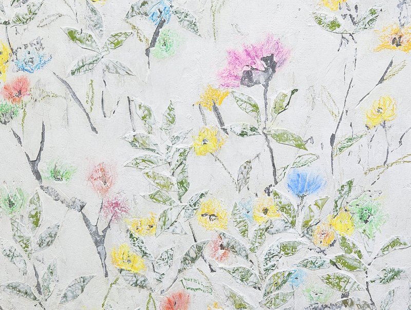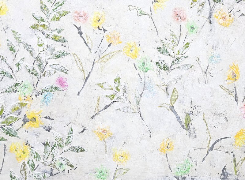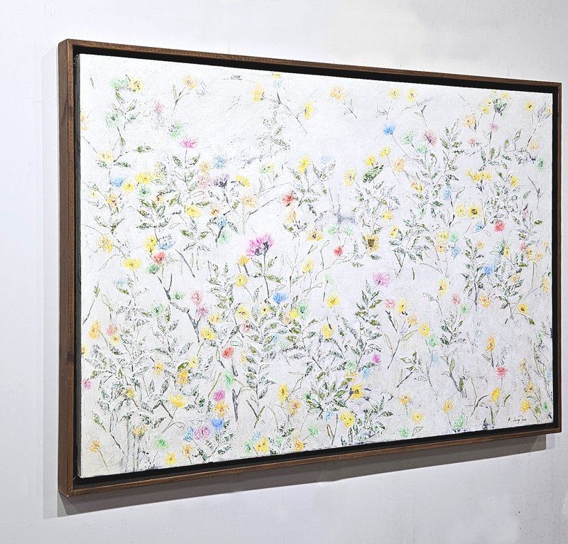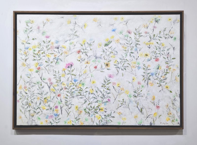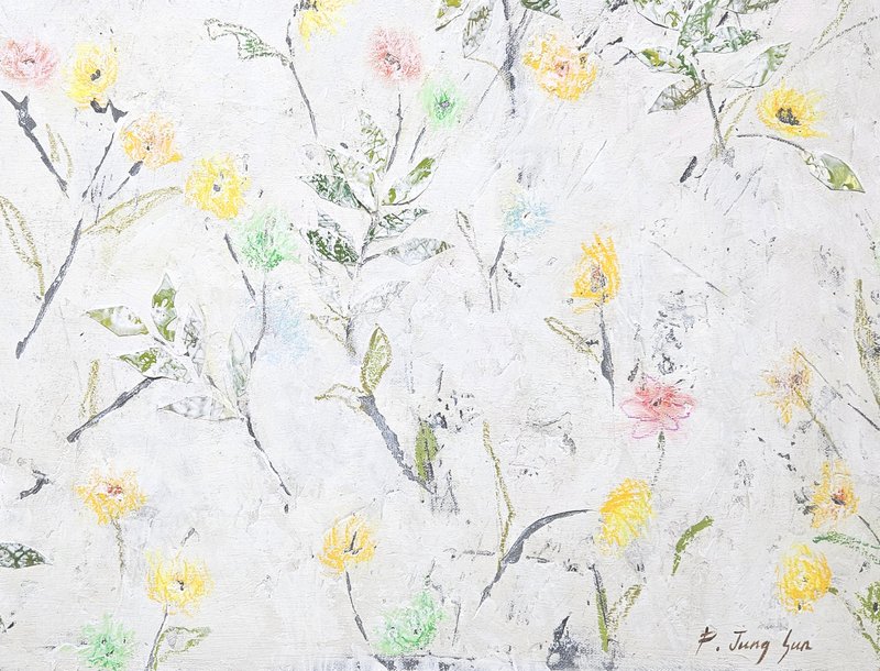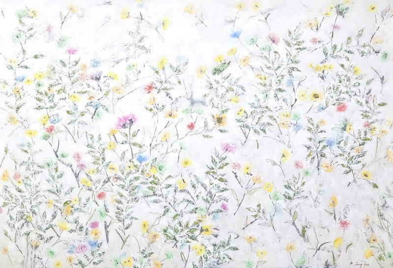 숲속에 투박하게 피어있는 듯한 꽃들이 표현되어 있습니다. 화려하거나 뚜렷한 형상을 하기보다는 빈티지하면서도 쓸쓸하고, 빽빽하면서도 듬성하게 보이죠. 박정선 작가는 주로 의식과 무의식 그 경계에 있는 상징적 표상을 화면 위에 구현합니다. 이 작품에서는 숲의 잔상들을 통해 익숙하고도 낯선 구성과 대상으로 감상자에게 다가가고 있습니다. 건조하고 자유로운 선과 물감 드리핑으로 이루어진 작가만의 표현법으로 완성된 특유의 몽환적인 분위기를 느껴보시기를 바랍니다.