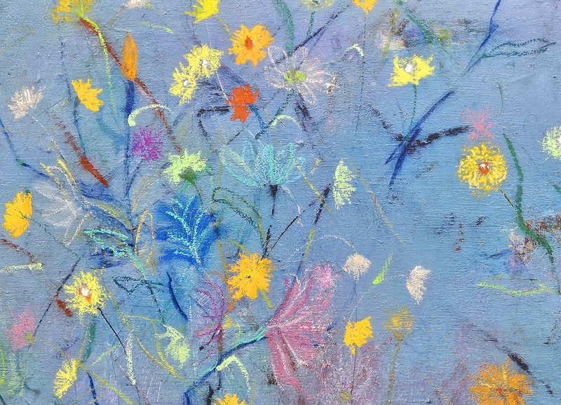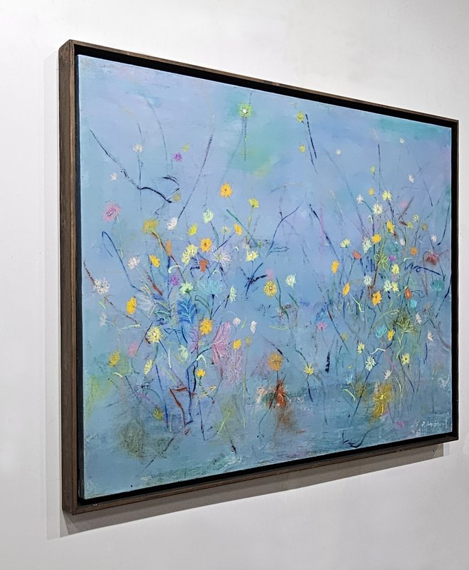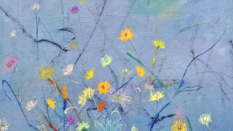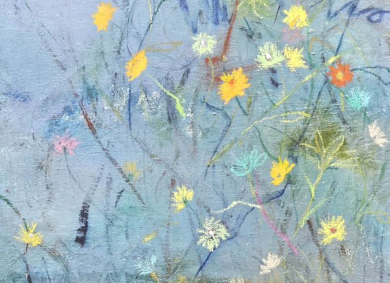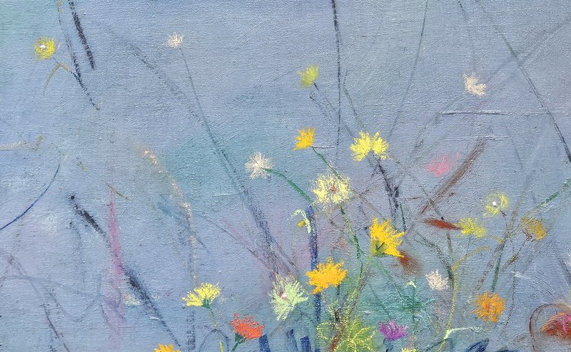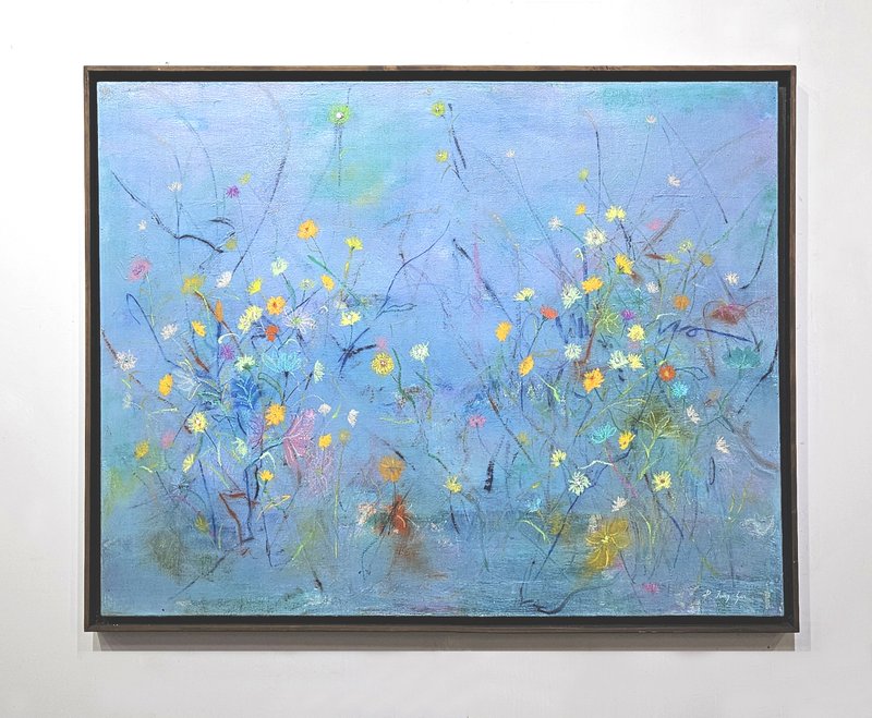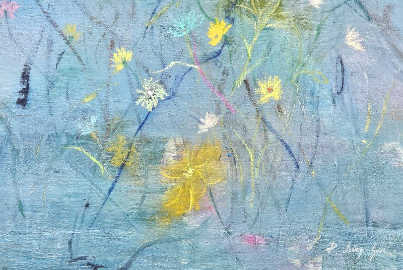 숲속에 투박하게 피어있는 듯한 꽃들이 표현되어 있습니다. 화려하거나 뚜렷한 형상을 하기보다는 빈티지하면서도 쓸쓸하고, 빽빽하면서도 듬성하게 보이죠. 박정선 작가는 주로 의식과 무의식 그 경계에 있는 상징적 표상을 화면 위에 구현합니다. 이 작품에서는 숲의 잔상들을 통해 익숙하고도 낯선 구성과 대상으로 감상자에게 다가가고 있습니다. 건조하고 자유로운 선과 물감 드리핑으로 이루어진 작가만의 표현법으로 완성된 특유의 몽환적인 분위기를 느껴보시기를 바랍니다.