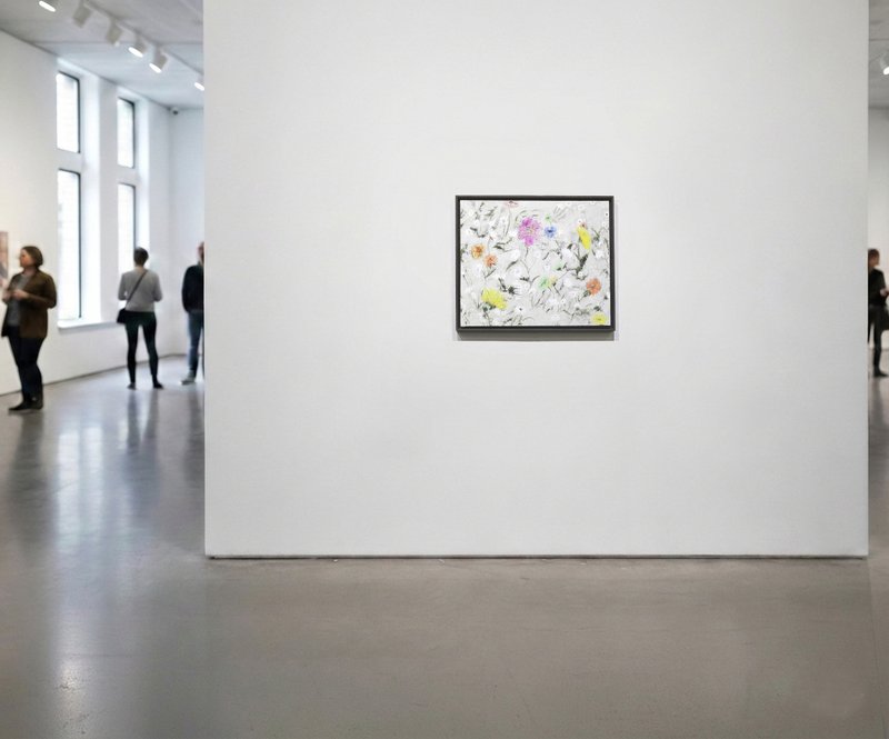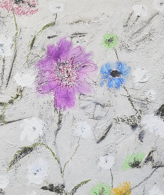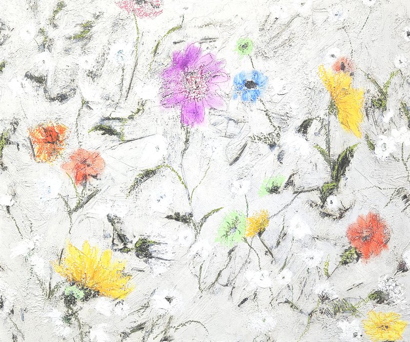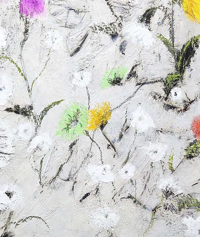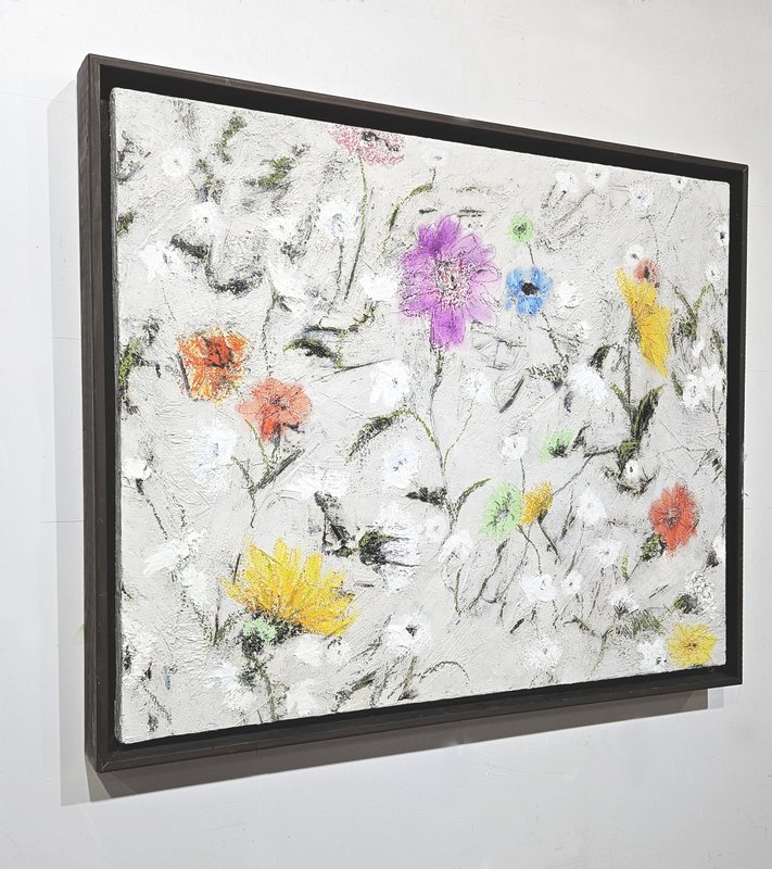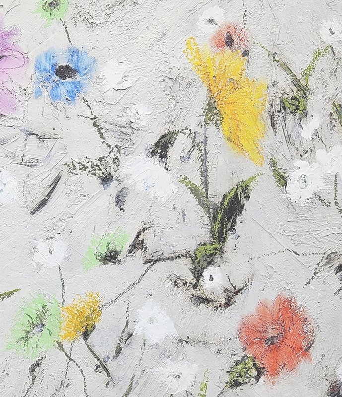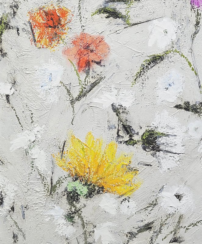 숲속에 투박하게 피어있는 듯한 꽃들이 표현되어 있습니다. 화려하거나 뚜렷한 형상을 하기보다는 빈티지하면서도 쓸쓸하고, 빽빽하면서도 듬성하게 보이죠. 박정선 작가는 주로 의식과 무의식 그 경계에 있는 상징적 표상을 화면 위에 구현합니다. 이 작품에서는 숲의 잔상들을 통해 익숙하고도 낯선 구성과 대상으로 감상자에게 다가가고 있습니다. 건조하고 자유로운 선과 물감 드리핑으로 이루어진 작가만의 표현법으로 완성된 특유의 몽환적인 분위기를 느껴보시기를 바랍니다.
