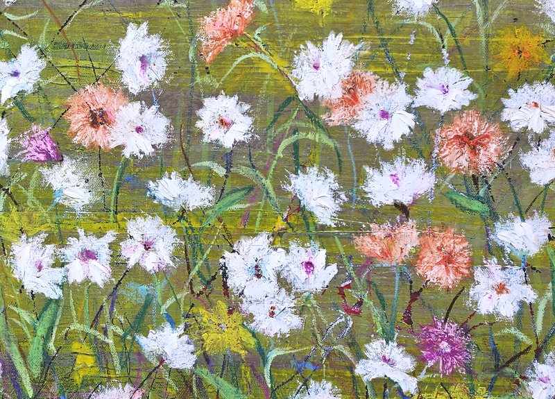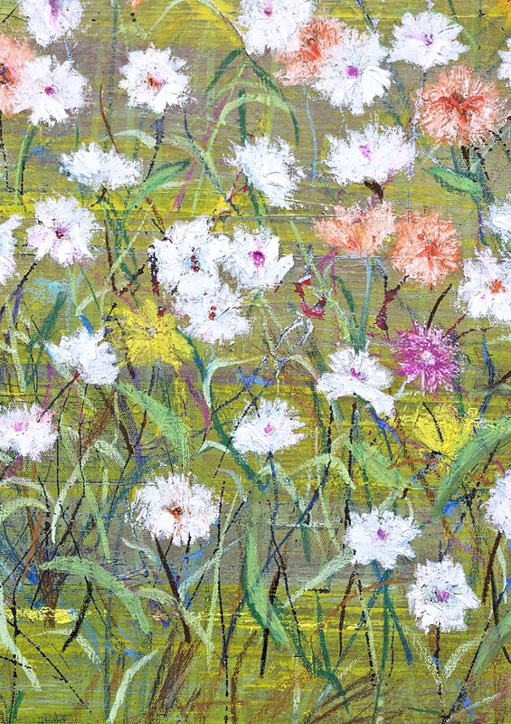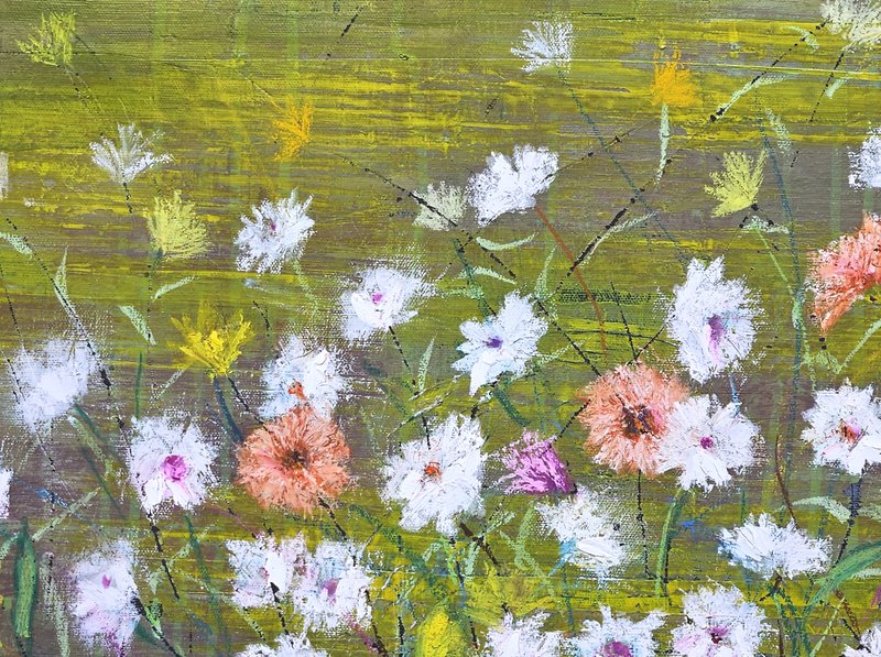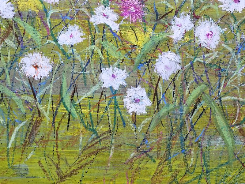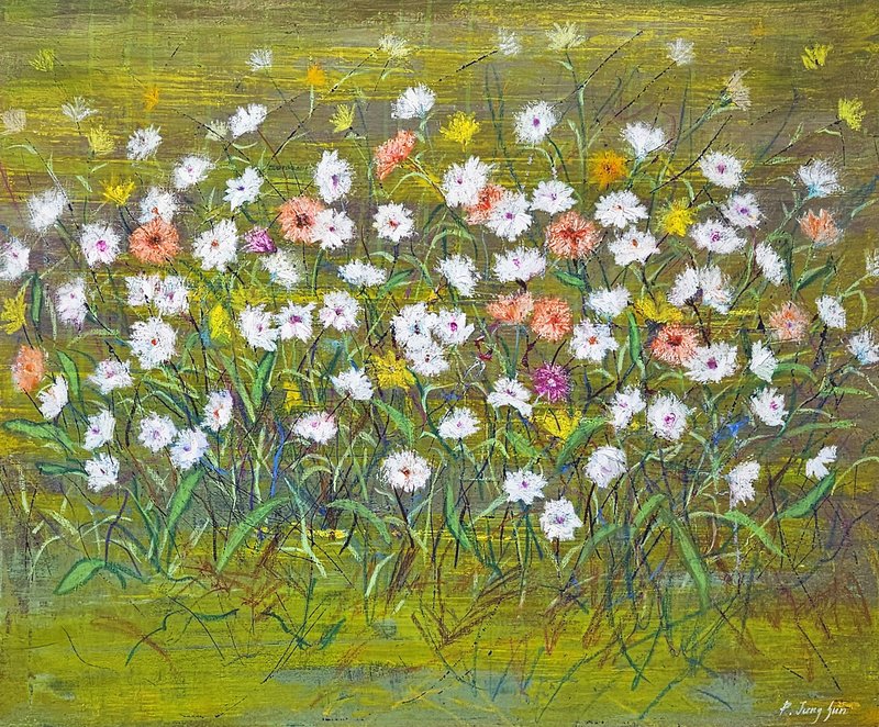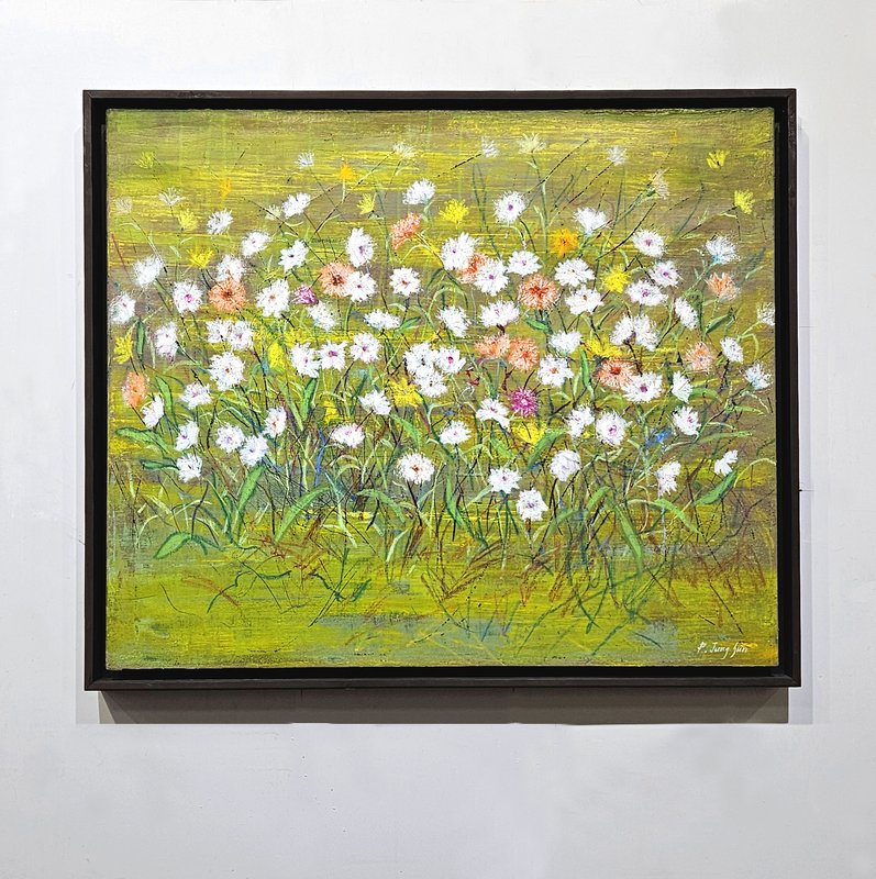 숲속에 투박하게 피어있는 듯한 꽃들이 표현되어 있습니다. 화려하거나 뚜렷한 형상을 하기보다는 빈티지하면서도 쓸쓸하고, 빽빽하면서도 듬성하게 보이죠. 박정선 작가는 주로 의식과 무의식 그 경계에 있는 상징적 표상을 화면 위에 구현합니다. 이 작품에서는 숲의 잔상들을 통해 익숙하고도 낯선 구성과 대상으로 감상자에게 다가가고 있습니다. 건조하고 자유로운 선과 물감 드리핑으로 이루어진 작가만의 표현법으로 완성된 특유의 몽환적인 분위기를 느껴보시기를 바랍니다.