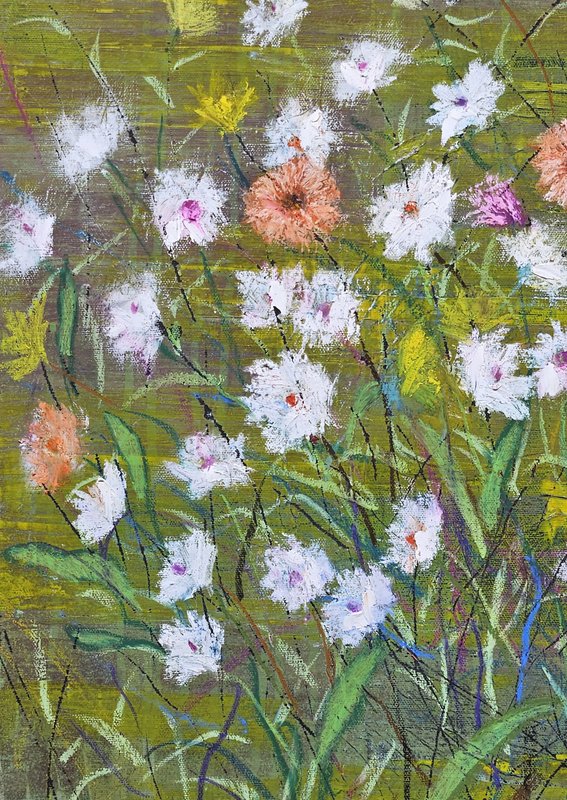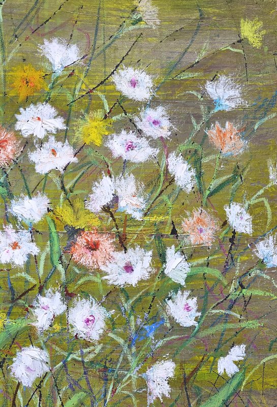 숲속에 투박하게 피어있는 듯한 꽃들이 표현되어 있다. 화려하거나 뚜렷한 형상을 하기보다는 빈티지하면서도 쓸쓸하고, 빽빽하면서도 듬성하게 보인다. 박정선 작가는 주로 의식과 무의식 그 경계에 있는 상징적 표상을 화면 위에 구현한다. 이 작품에서는 숲의 잔상들을 통해 익숙하고도 낯선 구성과 대상으로 감상자에게 다가가고 있다. 건조하고 자유로운 선과 물감 드리핑이 작가만의 표현법을 살려내며 특유의 몽환적인 분위기를 낸다.