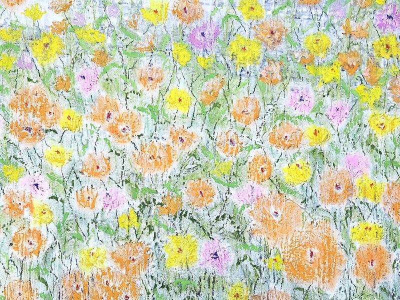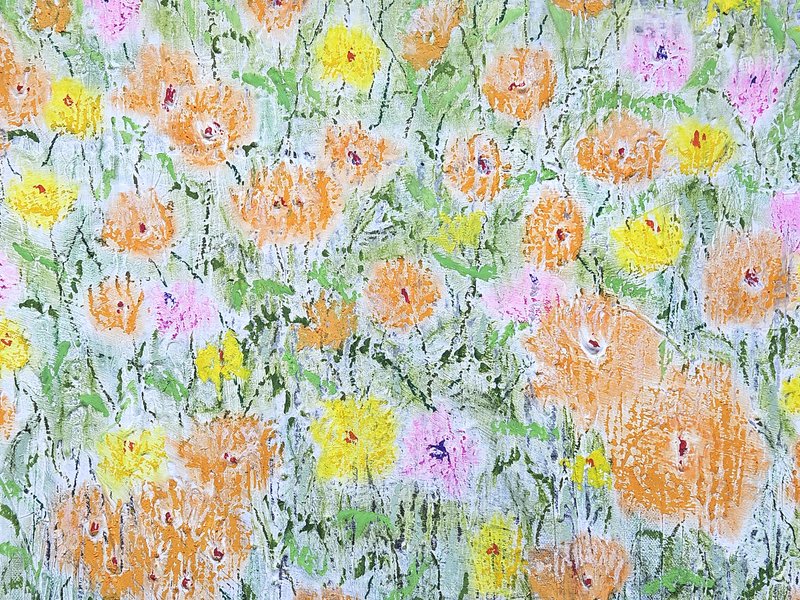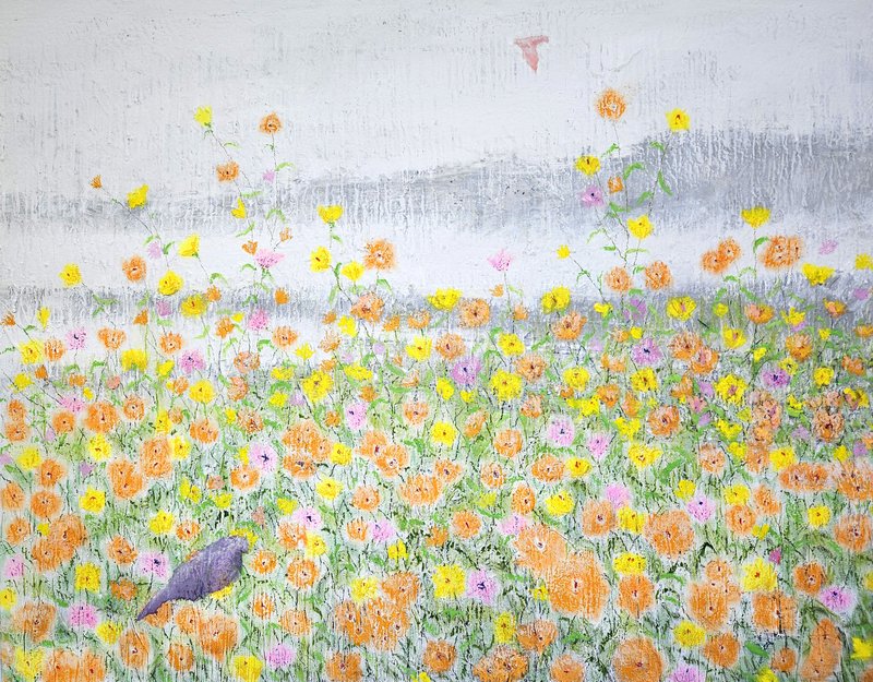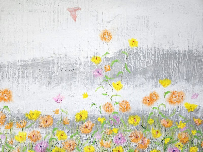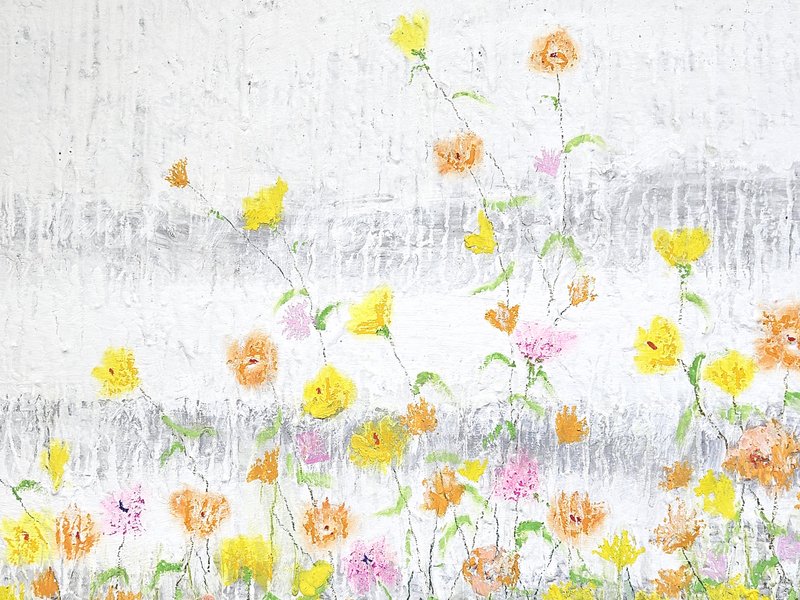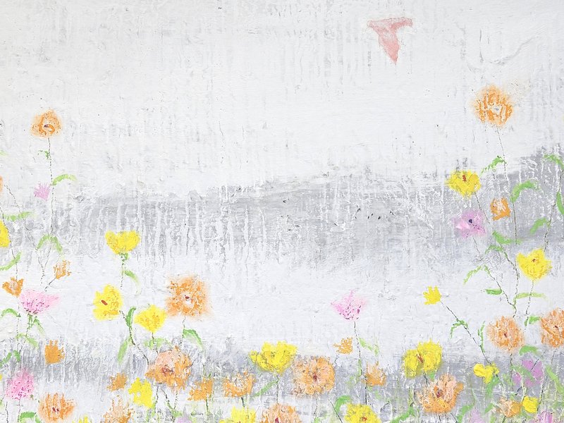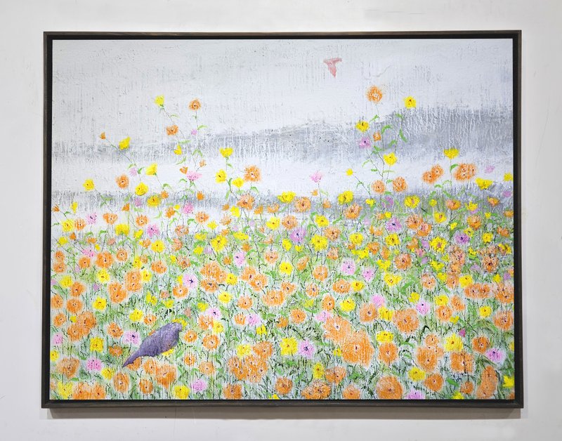 숲속에 투박하게 피어있는 듯한 꽃들이 표현되어 있습니다. 화려하거나 뚜렷한 형상을 하기보다는 빈티지하면서도 쓸쓸하고, 빽빽하면서도 듬성하게 보이죠. 박정선 작가는 주로 의식과 무의식 그 경계에 있는 상징적 표상을 화면 위에 구현합니다. 이 작품에서는 숲의 잔상들을 통해 익숙하고도 낯선 구성과 대상으로 감상자에게 다가가고 있습니다. 건조하고 자유로운 선과 물감 드리핑으로 이루어진 작가만의 표현법으로 완성된 특유의 몽환적인 분위기를 느껴보시기를 바랍니다.