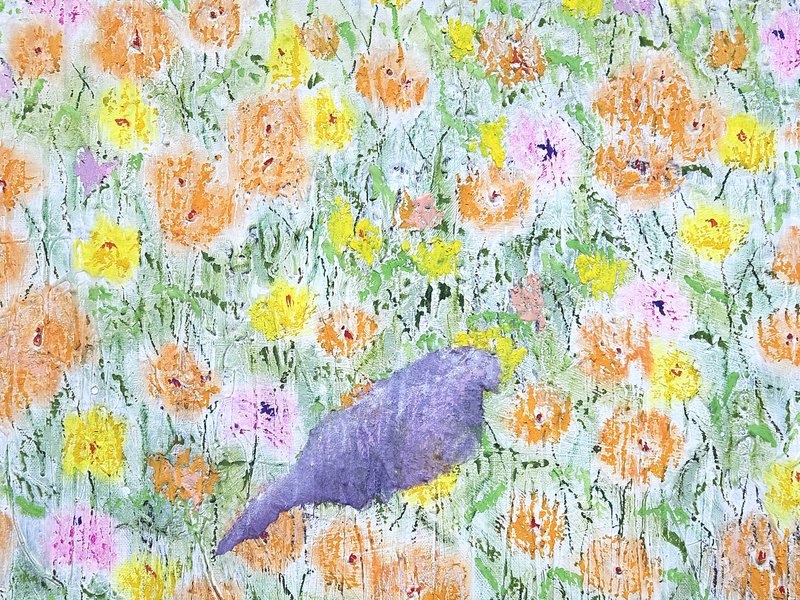 숲속에 투박하게 피어있는 듯한 꽃들이 표현되어 있다. 화려하거나 뚜렷한 형상을 하기보다는 빈티지하면서도 쓸쓸하고, 빽빽하면서도 듬성하게 보인다. 박정선 작가는 주로 의식과 무의식 그 경계에 있는 상징적 표상을 화면 위에 구현한다. 이 작품에서는 숲의 잔상들을 통해 익숙하고도 낯선 구성과 대상으로 감상자에게 다가가고 있다. 건조하고 자유로운 선과 물감 드리핑이 작가만의 표현법을 살려내며 특유의 몽환적인 분위기를 낸다.