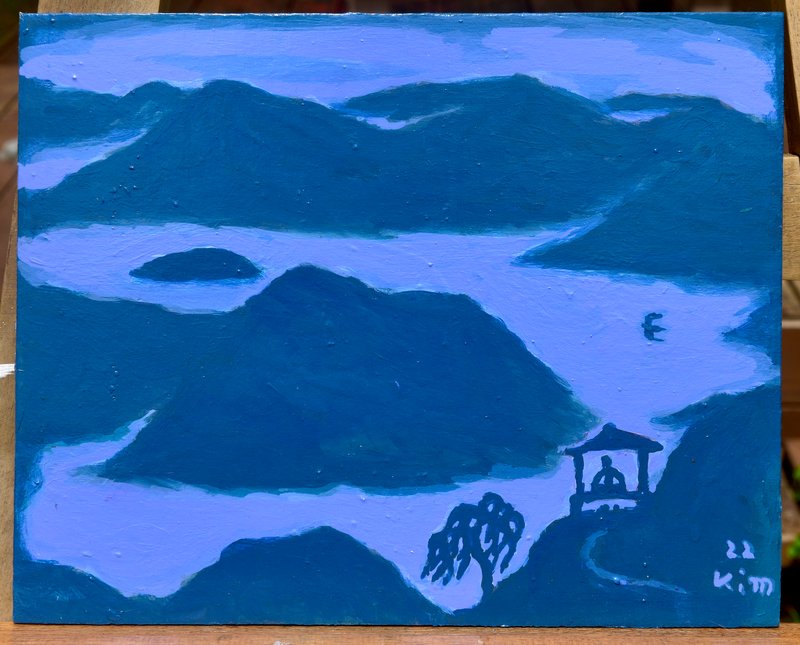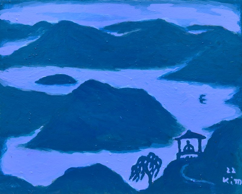 작품은 작가가 세상을 바라보는 시선에 따라 따뜻하기도, 차갑기도, 단조롭기도, 재미있기도 합니다. 김용철 작가는 작가가 삶을 살아가면서 “채집”한 다양한 삶의 순간들을 한 폭의 그림에 따뜻하게 담아냅니다. 작은 집, 나무, 배를 타고 가는 사람 등이 그려져 있는 작가의 작품은 인생에서 만나는 어느 순간 하나, 어느 사물 하나도 놓치지 않고 그 속에서 의미를 찾아내려는 작가의 세계관을 잘 드러냅니다. 한 가지 메인 색상으로 전체 풍경을 그려낸 작가의 작품은 마치 어린 시절 학교에서 만든 고무 판화 같기도 하고 여백 없이 가득 채운 동양화 같기도, 고대 선사시대 유물 속에서 발견되는 유적지 그림 같기도 합니다. 이렇게 여러 가지 얼굴을 가지고 있는 작가의 작품은 우리가 일상에서 가까이 두고 보아도 볼 때마다 새로운 의미를 발견할 수 있고 그 속의 이야기를 찾아낼 수 있어 나날이 색다른 영감을 주는 그림입니다. 그림 한편에 자리한 자그마한 인간의 모습과 그 주위의 커다란 자연환경, 이름 모를 사물들은 우리 주변을 둘러싸고 있는 환경과 그 속에 무궁무진하게 펼쳐져 있는 가능성에 관해 이야기해 줍니다. 달밤에 배를 타고 가는 사람 위로 쏟아져 내려오는 햇살 또는 별빛과 같은 사선 방향의 밝은 빛은 그림 전체를 아스라이 밝혀주며 고요하고 아름다운 깊은 밤 속에 포근히 싸여 있는 것 같은 느낌을 불러일으킵니다.