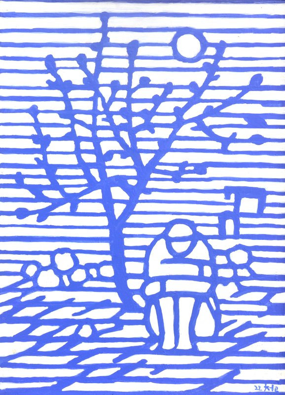 우리는 삶을 살아가면서 생각지도 못하게 이어져 있는 순간들에 놀랄 때가 있습니다. 우연히 만났던 친구를 통해 일자리를 얻게 된다든지, 누군가가 떨어뜨리고 간 벙어리 장갑을 보고 어린 시절 옛 친구를 떠올리기도 하는 것이 이러한 순간들 아닐까요? 작가는 인생의 많은 순간들이 서로 연결되어 있으며 이전의 기억들, 사물들, 사람들과 함께 어우러져 존재한다는 것을 그림 속에 담아냅니다. 마치 강물 같기도 한 그림 속 길은 그 길을 걸어가면서 우리가 겪는 다양한 삶의 장면들을 꿰뚫는 인생의 길 같기도 합니다. 전반적으로 푸른 색이 사용되어 차분하면서도 부드럽고 굵은 선끼리 서로 맞닿아 있는 그림 속 사물들은 보면 볼수록 차가움과 부드러움을 동시에 보여주는 신비로운 세계 같습니다. 마치 눈물을 머금은 듯 흐릿하면서 파스텔 톤의 푸른색이 섞여 있는 이 작품은 각각의 사물들이 뚜렷하지는 않지만 서로 어우러져 우리의 세상을 만들어가는 것을 보여줍니다. 무채색 배경의 벽에 전시하면 다양한 장면을 속에 담고 있는 한 조각의 커다란 모자이크 같은 느낌을 줄 작품입니다.