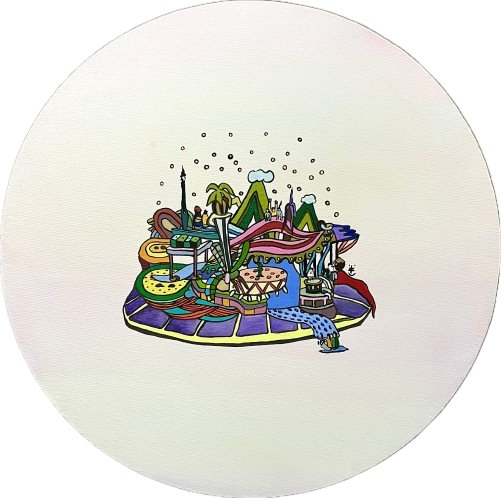 머뭇거림 없이 한 호흡에 그려 나간 듯이 보이는 선이 경쾌하고 밝은 분위기를 전해줍니다. 일상에서 흔히 볼 수 있는 작은 도상들이 캔버스 곳곳에 배치되어 있어 시선을 따라가다 보면 작가가 들려주는 이야기를 발견하게 됩니다. 어떠한 법칙에도 지배되지 않는 듯 자유분방한 풍경이 단조롭고 반복적인 일상에 지쳐 휴식이 필요한 우리에게 편안하면서 재치 있게 위안을 주고 있습니다. 점과 선의 리듬감이 돋보이고 종이 위로 도상들이 오밀조밀하게 모여 있는 곳과 면으로 채색된 부분이 과하지 않은 균형을 이루며 공간에 음악적인 변주를 줄 것입니다. 음악을 들으며 스트레스를 해소하듯, 자유로운 선과 밝은 색채를 통해 활력을 얻을 수 있습니다.