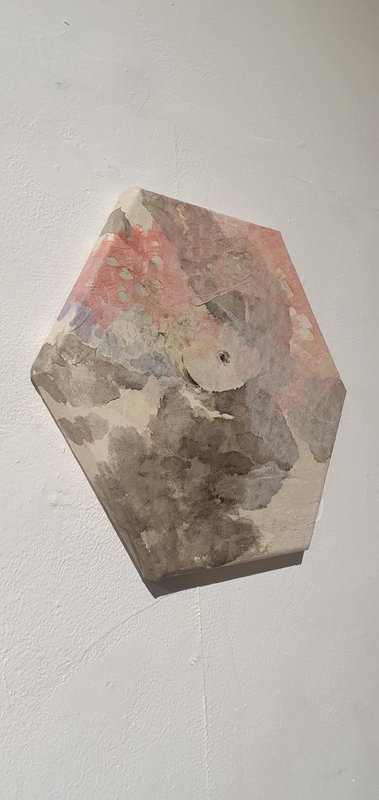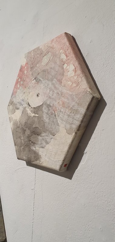 각진 캔버스 위의 은은한 색감과 먹의 흐름이 느껴집니다. 유윤빈 작가는 진하고 강한 색채 표현보다도 은은하고 담담한 맛을 이루어내는 것이 훨씬 어렵다고 말합니다. 감상자에게도 강렬한 표현은 단번에 눈길을 사로잡지만, 자극적인 음식은 쉽게 질리기도 한다는 것인데요. 실제로 담백한 표현은 질리지 않는 매력이 있죠. 작가의 작품에는 계산되지 않은 편안한 붓놀림과 색채가 자연스럽게 펼쳐져 있습니다. 더불어 여러 마리의 물고기보다 한 마리의 등장으로 작품에는 유유자적한 느낌이 더해집니다. 유윤빈 작가의 편안하고도 유니크한 작업을 감상해 보실 것을 추천 드립니다.