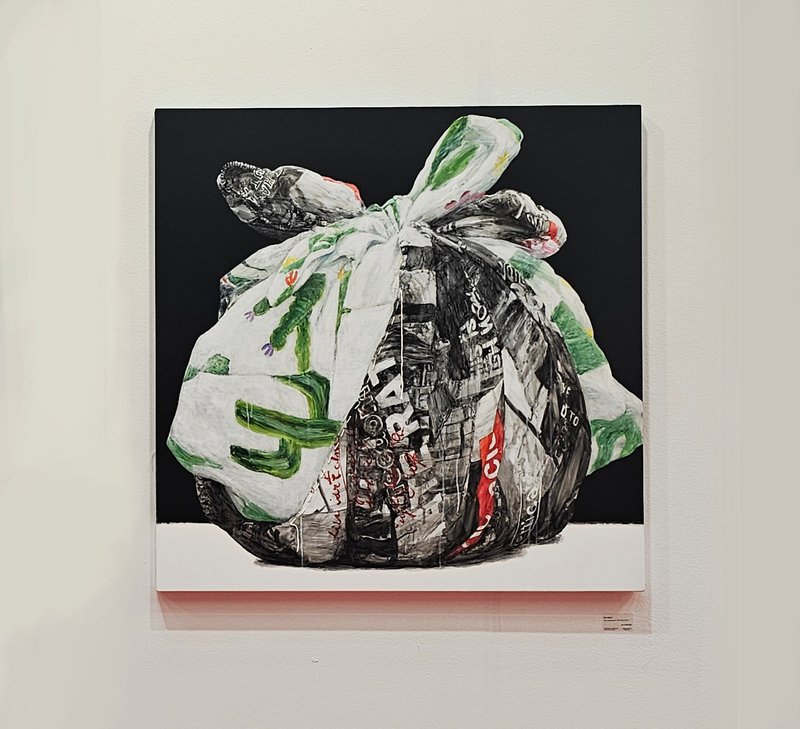 보통 박용일 작가의 작품에는 보따리 겉면에 오래된 주택, 가로수, 거리를 지나는 행인, 버스 등 일상적인 도상이 많이 등장합니다. 하지만 이 작품은 어쩐지 구체적인 내용이 그려져 있지 않습니다. 아무런 형체를 알아볼 수 없는 채로 원색의 유화 물감이 서로 충돌하고 있습니다. 누구의 것인지, 어떤 물건이 들어 있을지, 왜 짐을 싸게 되었을지 등에 대한 이야기들을 상상해 볼 수 없습니다. 반면, 그러한 이야기들을 삼켜버리듯 강한 시각적 자극을 주는 붉은색이 배경에서 강한 존재감을 드러냅니다. 그래서 이 작품은 역설적으로 더욱더 보따리를 싸고 이동할 수밖에 없었던 서민들의 이야기에 대한 관심을 환기하고, 그들에 대해 알고 싶게 합니다. 원색의 강렬한 대비와 그 이면에 놓인 이야기를 함께 느끼고 경험해 보시길 바랍니다.