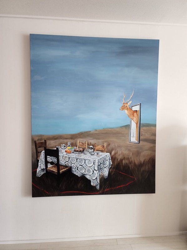 아름다운 그러나 몽환적인 자연 풍경과 사실적인 사물 묘사가 한데 어우러져 시선을 끕니다. 이 작품에서 자연은 현대 사회를 대변합니다. 너무도 빨리 변화하기에 적응하기 힘든 오늘날 사회는 사람들의 불안을 증폭시키고 전전긍긍하게 하죠. 그래서인지 작품 속 자연은 광활하고 막막한 창백한 공간으로 다가옵니다. 반면 붉은 선 안에서는 차분하고 섬세하게 표현된 오브제들이 안정감을 주고 있어요. 자연 공간과 사적 공간의 대립 구도, 현대인의 심리 상태를 반영한 색감 등이 흥미로운 이 작품은 전시 공간에 새로운 긴장감을 가져다줄 것입니다. 초현실주의적인 현대적 작품으로 색다른 공간을 꾸며 보시기 바랍니다.