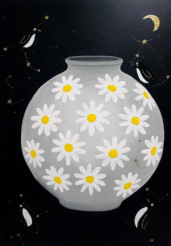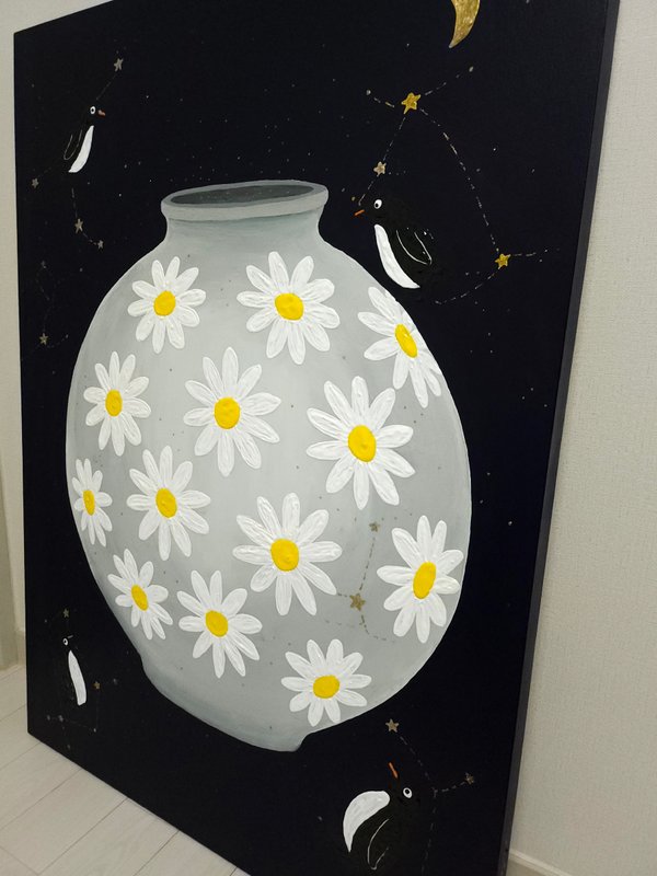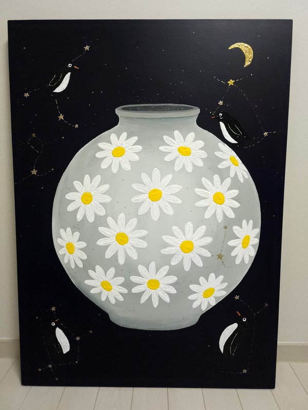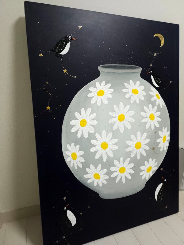 촉촉하고 따뜻한 품처럼 우주는 모든 존재의 너른 지평입니다. 이곳에서는 만물이 재편성되고 생산에 생산을 거듭합니다. 칠흑처럼 어둡고 정적인 듯하면서도 무궁무진한 생명이 역동적으로 살아 숨 쉬는 우주. 여기에서 우리의 동경과 이상은 어떻게 넘실대고 아로새겨질 수 있을까요? 최소윤 작가는 삶에 지칠 때마다 화폭에 자신만의 이상세계를 아름답게 그려냈습니다. 복잡다단한 심정과 근심은 어두운 색조와 밝은 색조를 넘나들며 그림을 그리는 과정에서 사라지며 치유가 되었다고 하네요. 붓질 하나하나 작가의 숨결이 닿아 있는 이 작품을 바라본다면, 여러분께 분명 그 풍부한 긍정의 기운이 전달될 것 같습니다.