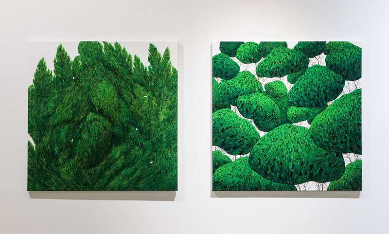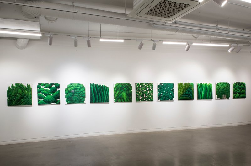 물결 치는 초록의 덩어리들이 화면 위에 흩어져 있다. 익숙한 잎사귀 같기도 하고, 낯선 생명체 같기도 하다. 김봄 작가의 '더 초록' 시리즈에서는 다양한 시간대와 장소에서 수집된 초록의 형상들이 존재한다. 김봄 작가가 집요하게 그려낸 세밀한 잎맥, 줄기, 잎의 결에는 현실의 관찰과 상상의 투사가 동시에 존재하며, 그 안에서 흰 새, 거미줄, 작은 꽃 같은 이질적 요소들은 상상과 현실의 경계를 흐리게 만든다. 작품 속 '더 초록'의 ‘더’라는 말은 초록을 지칭하는 정관사 the와 비교급 more의 중의적 의미를 품는다. 이는 작품의 무한한 확장과, 들뢰즈와 가타리가 말한 리좀 개념을 상상할 수 있다. 이 나무들은 특정한 중심 없이 엉켜 있고, 어떤 지점이든 다른 지점과 연결될 수 있다. 작가는 정사각형 프레임 위에 나무의 일부를 반복해 담으며, 폐쇄된 구조가 아닌 개방적 연결망으로서의 자연을 제시한다. 이 초록들은 서로 흩어지고 엉기며, 감각의 지형을 다시 그린다.