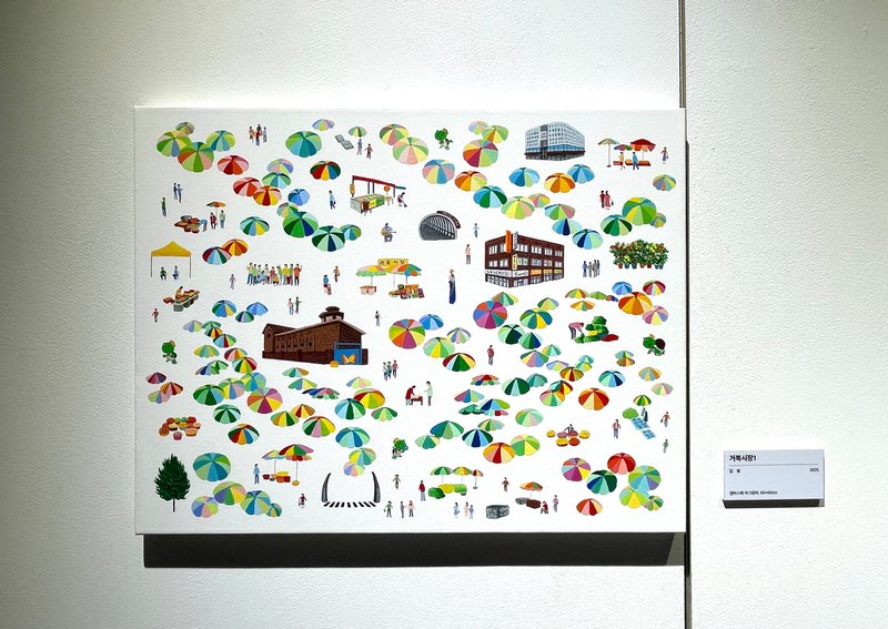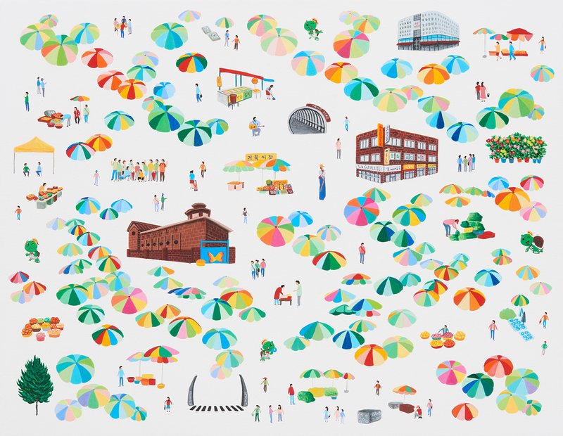 도시에 있어 시간과 삶의 흔적은 사람들에게 안정감을 준다. 같은 맥락에서 김봄 작가는 시간과 삶의 흔적이 현대 도시 속에 보존될 때 그 가치가 소중하게 기억된다고 생각하며, 시시각각 변하는 도시 풍경에 다양한 이야기를 기록하고자 한다. 장소와 관련된 건축물뿐 아니라 그곳과 관련된 사건을 담는다는 점이 매우 흥미롭게 다가온다. 작가는 주로 조감법을 사용하여 특정 장소를 한눈에 볼 수 있도록 그려내거나 다양한 요소들을 평면적으로 배치한다. 실제로 답사를 다니며 사진을 찍거나, 인터넷을 통해 얻은 상세한 정보를 바탕으로 완성된 사실적인 작품이지만 원근법의 파괴, 건축물 혹은 인물의 임의적 배치 등을 통해 비현실적이고 추상적인 느낌마저 연출한다.