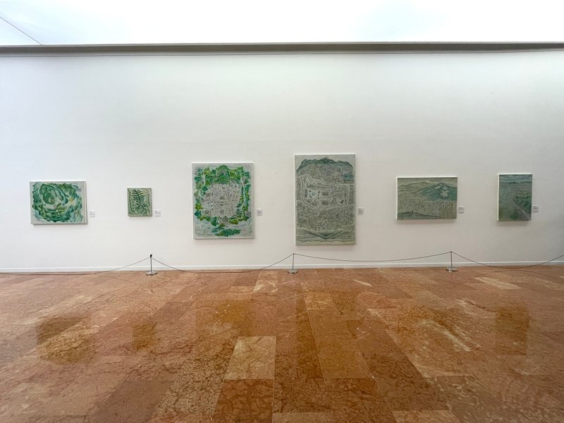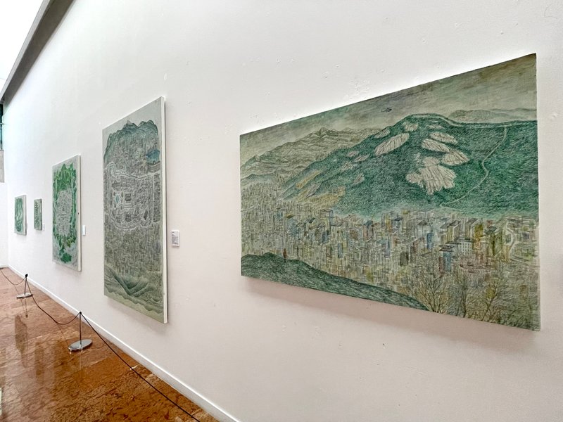 물결 치는 초록의 덩어리들이 화면 위에 흩어져 있다. 익숙한 잎사귀 같기도 하고, 낯선 생명체 같기도 하다. 김봄 작가의 '더 초록' 시리즈에서는 다양한 시간대와 장소에서 수집된 초록의 형상들이 존재한다. 김봄 작가가 집요하게 그려낸 세밀한 잎맥, 줄기, 잎의 결에는 현실의 관찰과 상상의 투사가 동시에 존재하며, 그 안에서 흰 새, 거미줄, 작은 꽃 같은 이질적 요소들은 상상과 현실의 경계를 흐리게 만든다. 작품 속 '더 초록'의 ‘더’라는 말은 초록을 지칭하는 정관사 the와 비교급 more의 중의적 의미를 품는다. 이는 작품의 무한한 확장과, 들뢰즈와 가타리가 말한 리좀 개념을 상상할 수 있다. 이 나무들은 특정한 중심 없이 엉켜 있고, 어떤 지점이든 다른 지점과 연결될 수 있다. 작가는 정사각형 프레임 위에 나무의 일부를 반복해 담으며, 폐쇄된 구조가 아닌 개방적 연결망으로서의 자연을 제시한다. 이 초록들은 서로 흩어지고 엉기며, 감각의 지형을 다시 그린다.