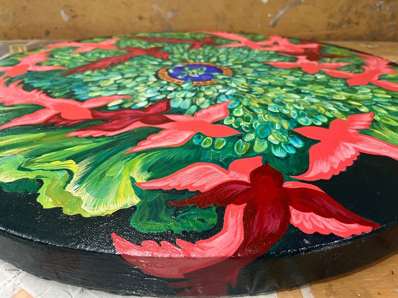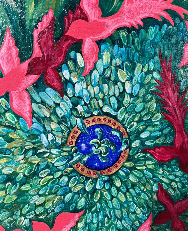 '자연'이나 '문화', '사회'와 우리 인간은 단순히 일면적인 관계를 맺지는 않습니다. 현대인들은 자연과 문화, 사회 속에서 수많은 관계들을 만들며 살아가기 때문이죠. 일례로 자연은 태초의 원형 그대로 완전해야 하는 영원한 고향이자 목적지이기도 하고, 정복해야 할 대상이기도 하고, 늘 인간의 손길을 거쳐야 안전해질 수 있는 위험천만한 야생의 날것 그 자체이기도 합니다. 색색의 화려한 꽃잎, 힘차게 뻗어가는 나무, 요동치는 물결들 안에서 그렇게 우리 인간들의 다양한 삶의 결이 새겨지고, 지워지기를 반복할 것입니다. 인간과 자연과 문화, 사회가 함께 한 폭의 작품으로 녹아들어 호흡하는 황지현 작가의 작품과 함께 라면, 우리는 보다 거시적인 관점에서 참된 조화를 되새기고, 깊이 생각할 기회를 가질 수 있지 않을까요?