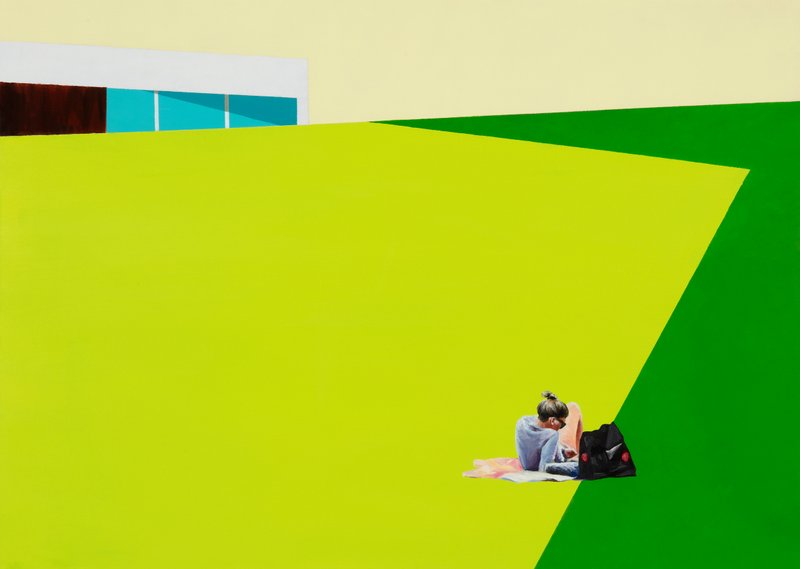 단색으로 이루어진 수영장이 캔버스의 거의 전부를 차지하고 있다. 단색의 수영장이 그리는 뚜렷한 경계선, 자로 잰 듯 똑바른 지평선이 20세기 초의 색면추상이나 몬드리안의 추상을 떠올리게 한다. 박상희 작가의 수영장은 보통의 수영장과는 다르다. 추상적인 그림의 여타 부분과는 달리 사실적으로 표현된 사람 하나가 수영복을 입고 곧 수영하려는 듯 자세를 취하고 있다. 이 점이 채도 높은 색으로 채워진 직사각형의 공간이 수영장이라는 사실을 알려주는 유일한 힌트이다. 이 그림의 묘미는 감각적인 색감과 과감한 구성에만 있는 것이 아니다. 누군가에게는 쉽사리 뛰어들기 어려운 수영장이라는 공간을 소재로 택하되, 그것을 아주 매력적인 색으로 칠함으로써 작가는 그것이 삶에 대한 비유이든, 어떤 가치에 대한 비유이든 수영장을 더욱더 미지의 공간으로 보이게 만들었다. 이 그림은 관객들에게 무궁한 상상의 공간으로서 비현실적인 색의 수영장을 선사한다.