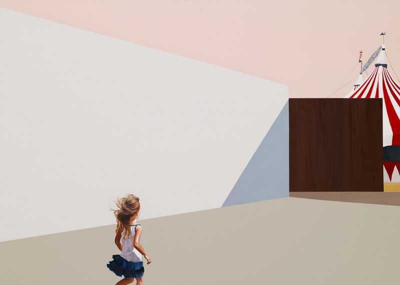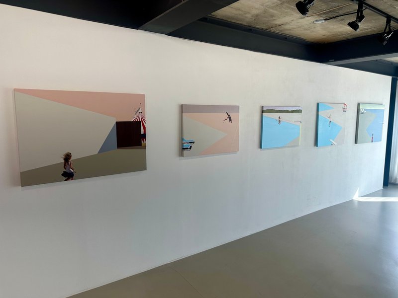 수영장은 우리에게 어떠한 공간일까요? 수영장은 도심 속에 재현된 자연입니다. 어떤 이들에게 수영장은 두려운 곳일 것이고, 어떤 이들에게 수영장은 어머니의 품처럼 안정감을 주는 곳일 것입니다. 이런 수영장을 소재로 택한 박상희 작가는 수영장을 물이 아니라 빈틈없는 색으로 가득 채워 캔버스 대부분을 차지하도록 하는 과감함을 보이는 동시에, 그림 속 인물은 생동감 있게 표현하여 독특한 대조를 그려냈습니다. 드넓은 수영장에서 ‘아직 수영을 시작하지 않은’ 인물은 삶 속에서 무엇인가를 헤엄쳐야 할 관객들의 거울과도 같습니다. 그러나 작가가 그려낸 ‘헤엄쳐야 할 그 무엇’은 감각적인 색감으로 관객들이 느낄 수 있듯 깊고 거칠기만 한 것이 아닌, 그 속을 알 수 없으나 기꺼이 뛰어들어볼 만한 매력을 가진 대상이 됩니다.