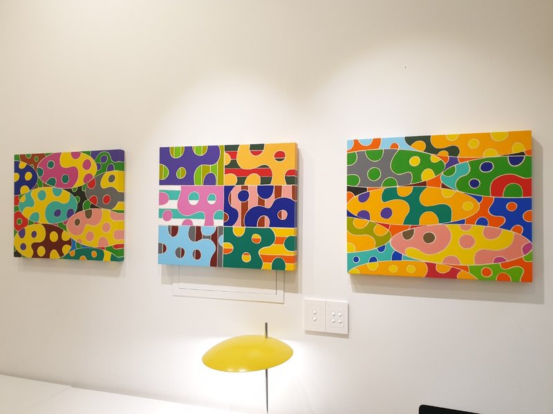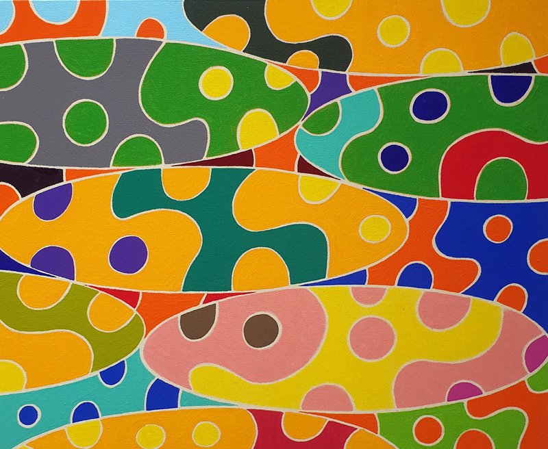 캔버스를 가로지르는 직선과 곡선들, 경계 지어진 면들, 그 면들을 채우는 다양한 색들. 작품은 우리의 시각경험에서 가장 기초적인 인지적 단위가 되는 대상들, 선, 면, 색 등으로 가득 차 있습니다. 이러한 점에서 작품은 그 자체로 흥미로운 시각적 자극이 될 수 있습니다. 하지만 작품은 단지 흥미로운 감각적 자극이 되는데 그치지 않습니다. 캔버스를 가로지르는 직선과 곡선들 중 어떤 것을 선택하느냐에 따라 우리가 작품에서 볼 수 있는 면은 형태와 크기를 달리합니다. 한 작품 속에서 여러 가지 형태들을 볼 수 있는 것입니다. 작품은 이처럼 감상자가 자유로운 시각적 상상에 참여하게 합니다. 뿐만 아니라 작품은 감상자로 하여금 경계와 차이에 대한 질문을 던지도록 유도합니다. 경계에 따라 생길 수 있는 인식의 차이가 얼마나 가변적인지, 작품을 통해 느껴보시기 바랍니다.