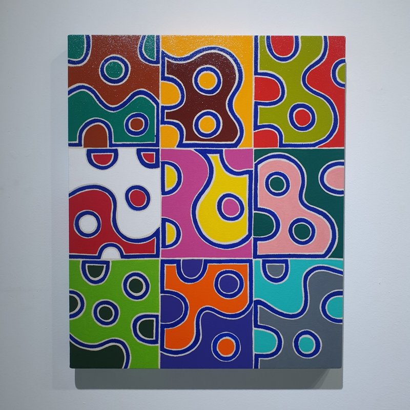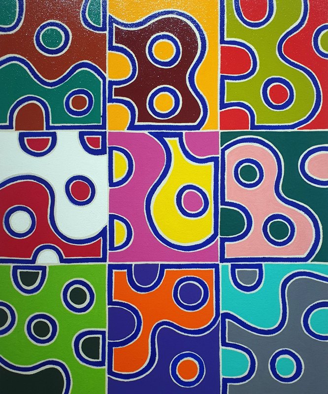 캔버스를 가로지르는 직선과 곡선들, 경계 지어진 면들, 그 면들을 채우는 다양한 색들. 작품은 우리의 시각경험에서 가장 기초적인 인지적 단위가 되는 대상들, 선, 면, 색 등으로 가득 차 있습니다. 이러한 점에서 작품은 그 자체로 흥미로운 시각적 자극이 될 수 있습니다. 하지만 작품은 단지 흥미로운 감각적 자극이 되는데 그치지 않습니다. 캔버스를 가로지르는 직선과 곡선들 중 어떤 것을 선택하느냐에 따라 우리가 작품에서 볼 수 있는 면은 형태와 크기를 달리합니다. 한 작품 속에서 여러 가지 형태들을 볼 수 있는 것입니다. 작품은 이처럼 감상자가 자유로운 시각적 상상에 참여하게 합니다. 뿐만 아니라 작품은 감상자로 하여금 경계와 차이에 대한 질문을 던지도록 유도합니다. 경계에 따라 생길 수 있는 인식의 차이가 얼마나 가변적인지, 작품을 통해 느껴보시기 바랍니다.