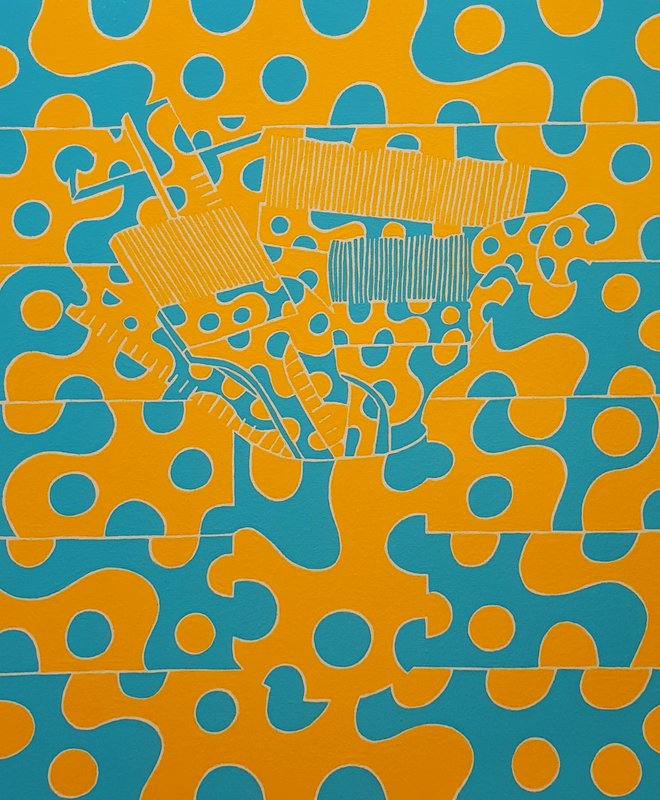 캔버스를 가로지르는 직선과 곡선들, 경계 지어진 면들, 그 면들을 채우는 다양한 색들. 작품은 우리의 시각경험에서 가장 기초적인 인지적 단위가 되는 대상들, 선, 면, 색 등으로 가득 차 있습니다. 이러한 점에서 작품은 그 자체로 흥미로운 시각적 자극이 될 수 있습니다. 하지만 작품은 단지 흥미로운 감각적 자극이 되는데 그치지 않습니다. 캔버스를 가로지르는 직선과 곡선들 중 어떤 것을 선택하느냐에 따라 우리가 작품에서 볼 수 있는 면은 형태와 크기를 달리합니다. 한 작품 속에서 여러 가지 형태들을 볼 수 있는 것입니다. 작품은 이처럼 감상자가 자유로운 시각적 상상에 참여하게 합니다. 뿐만 아니라 작품은 감상자로 하여금 경계와 차이에 대한 질문을 던지도록 유도합니다. 경계에 따라 생길 수 있는 인식의 차이가 얼마나 가변적인지, 작품을 통해 느껴보시기 바랍니다.