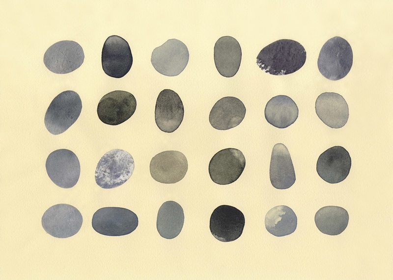 박예지나 작가의 작업은 “수집”으로부터 시작된다. 수집의 대상은 바로 산과 바다 근처, 그리고 개울가 등에서 볼 수 있는 돌이며, 여기에는 작가의 세계관이 자연스레 반영되어 있다. 자연 속에서 끝없는 마찰과 풍파를 겪은 후에 얻어진 둥그런 돌의 형태와, 특출함은 없지만 그 자체로 은은하고 잔잔한 빛을 발하는 색상은 작품에서 담백하게 재현된다. 작가는 특히 돌 표면에 남은 자연의 흔적을 유심히 관찰하고 ‘색상’과 ‘결’에 집중하여 이를 수채와 한지 콜라주로 표현한다. 단순한 돌의 배열과 평면적 구성은 시각적인 편안함을 제공하며 느리고 긴 호흡으로 자연을 관조하는 작가의 담담한 자연관을 대변한다.
