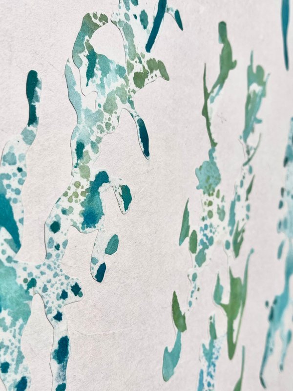 박예지나 작가의 작업은 “수집”으로부터 시작된다. 수집의 대상은 바로 산과 바다 근처, 그리고 개울가 등에서 볼 수 있는 풍경이며, 여기에는 작가의 세계관이 자연스레 반영되어 있다. 자연 속에서 끝없는 마찰과 풍파를 겪은 후에 얻어진 아름다운 자연의 부분들과, 특출함은 없지만 그 자체로 은은하고 잔잔한 빛을 발하는 색상은 작품에서 담백하게 재현된다. 작가는 특히 지나칠 법한 자연의 흔적을 유심히 관찰하고 ‘색상’과 ‘결’에 집중하여 이를 수채와 한지 콜라주로 표현한다. 단순한 색의 배열과 평면적 구성은 시각적인 편안함을 제공하며 느리고 긴 호흡으로 자연을 관조하는 작가의 담담한 자연관을 대변한다.