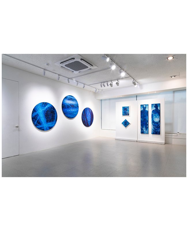 장지 위에 푸르게 펼쳐진 이지수 작가의 작품 세계는 우연과 의도 사이 어딘가를 유영한다. 안료가 어느 방향으로 뻗어나갈지 예측할 수 없음은 또다시 불명확한 풍경을 탄생시키는데, 이로써 작품 속 가득한 파란색은 바다와 하늘 모두를 아우르며 희망의 색으로 나타난다. 작업에 본인의 감정을 완벽히 밀착시키는 이지수 작가는 핸드페인팅을 통해 동양화의 지두법을 연상시키는 화법을 구사한다. 이는 정적인 색채로 배어든 작품의 곳곳에 온기를 불어넣는 역할을 한다. 작가가 손가락으로 획을 하나하나 그려낼 때, 그림 속 파란색은 저마다 다른 목소리를 갖게 된다. 감상자들은 눈앞의 선이 바람의 자국인지 여린 풀잎인지 알 수 없지만, 작가가 눌러 담은 시간과 공간의 리듬이 삶 전체를 은유하고 있음을 깨닫게 될 것이다.