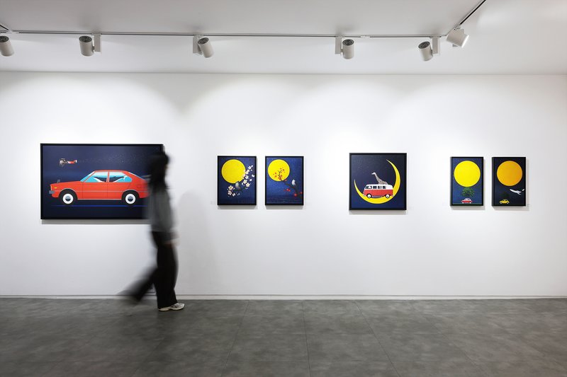 남재현 작가는 한눈에 들어오는 이미지 이외에 화면의 다른 요소를 더욱 유심히 바라도록 하는 장치들을 화면에 심어 놓았습니다. 특히, 작가의 상상력은 ‘달로 떠나보기’에서 더욱 흥미롭게 표현되고 있습니다. 배경처럼 보이는 검은 색 바탕이 실제로는 무척 아름답게 반짝이는 재료를 사용하여 햇빛을 받으면 달 이미지보다도 더 빛나는 효과를 줍니다. 이렇게 우리가 쉽게 지나치지만, 자세히 들여다보면 기존의 것들과는 또 다른 의미를 발견할 수 있습니다. 작가는 여러 장치를 화면 속에 숨겨 두고 관객이 한 번에 알아채지 못하지만 알아채고 나서는 그 즐거움을 오래 간직할 수 있는 ‘보는 즐거움’을 나누고자 합니다. 사람들의 꿈같은 바람을 화면에 재현한 작가의 창조적인 에너지는 무거운 현대 도시인들의 삶의 무게를 경쾌하게 이겨낼 방법을 제시하고 있습니다.