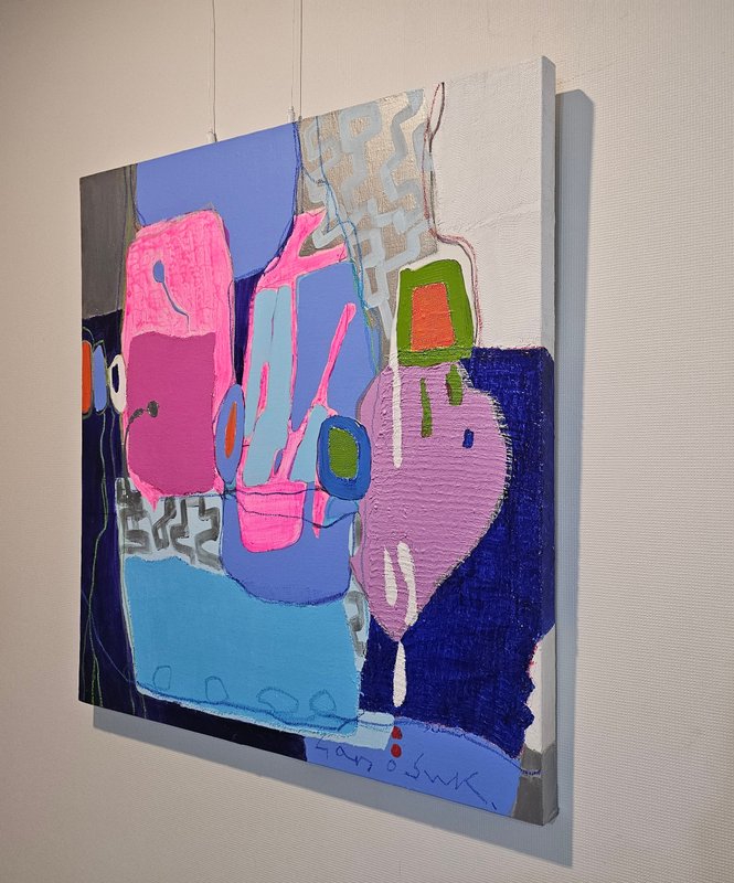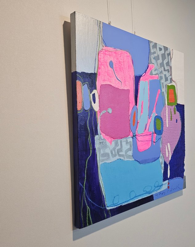 한영숙 작가의 작품은 서로 다른 색과 형태를 지닌 색면과 드리핑 기법을 사용한 점으로 구성되어 있습니다. 작품 속 조형 요소들은 마치 현대 사회를 살아가는 사람들의 모습과 닮아 있습니다. 우리가 사는 세상 속 각각의 생명체는 서로 영향을 주고받으며 살아갈 수밖에 없는 관계적인 존재인 동시에 개인은 고유의 독립된 인격체인 개성을 가집니다. 즉, 이 두 가지를 모두 수용한 한영숙 작가의 작품에서는 색면이 구성해 내는 조화의 아름다움을 느끼고, 그와 함께 우리가 사는 세상을 이루는 요소들의 관계와 ‘자유로운 질서’에 대해 생각해 볼 수 있습니다. 또한, 다름이 주는 조화를 통해 자유로운 상상력을 발휘할 수 있음은 물론 마음에 여유와 따뜻함을 불러일으킵니다.