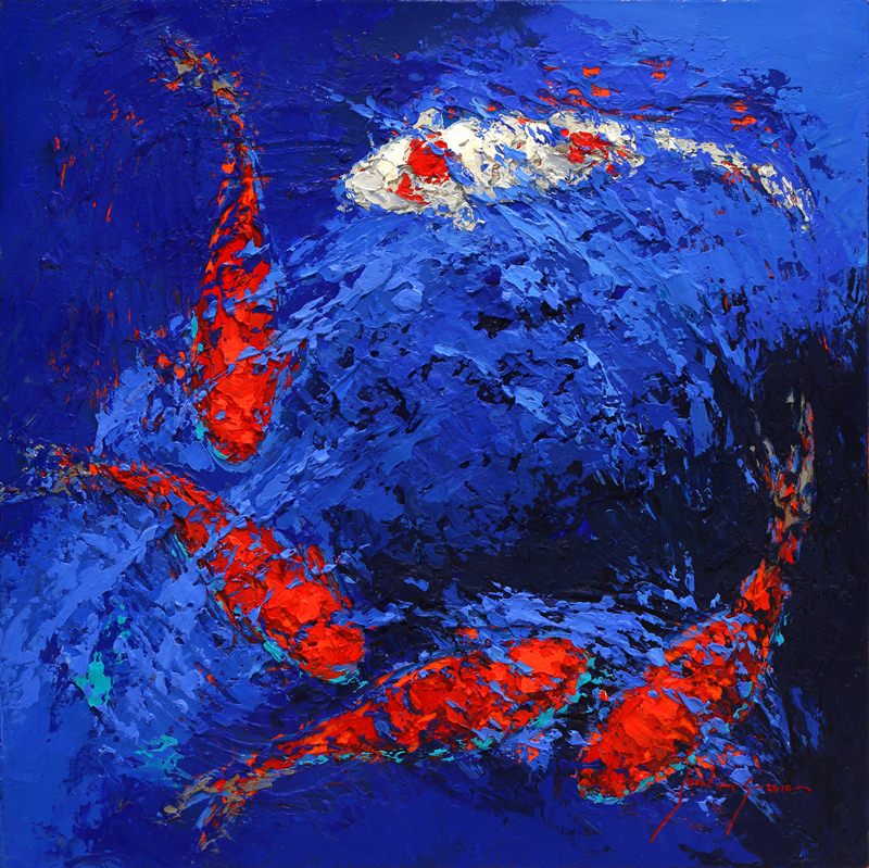 전미선 작가는 명도 높은 색채를 통해 대상에 활력과 생기를 불어넣는 작업을 선보인다. 작품 속에 등장하는 비단잉어(Koi)와 꽃들은 생명의 기쁨과 에너지를 표현하기 위한 작가의 대상으로, 화면의 중심 또는 화면 전체에 가득 그려지며 그 힘을 표출한다. 이러한 작가의 작업은 기법적인 특징이 눈길을 끄는데, 본래 비단잉어는 동양에서 풍요를 상징하는 영물로 이 동양적인 대상을 작가는 유화와 나이프를 이용해 서양의 기법으로 재해석한다. 대상을 붓으로 세밀하게 묘사하기보다는 나이프로 물감을 두껍게 발라내어 형상과 배경을 단순화하고, 대신 화사한 빛과 색채를 화면 전체에 채워내며 순간의 인상을 강조하는 것이다. 또한 나이프의 강약 조절에 의해 칠해진 두터운 마티에르에는 작가의 섬세한 호흡과 움직임이 그대로 담기어 작품에 힘을 더한다.