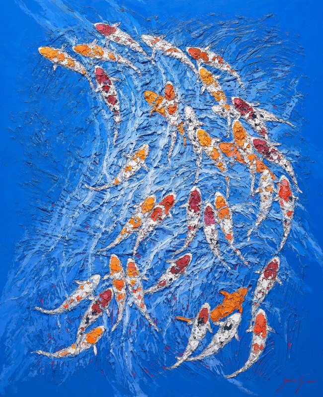 전미선 작가는 명도 높은 색채를 통해 대상에 활력과 생기를 불어넣는 작업을 선보인다. 작품 속에 등장하는 비단잉어(Koi)와 꽃들은 생명의 기쁨과 에너지를 표현하기 위한 작가의 대상으로, 화면의 중심 또는 화면 전체에 가득 그려지며 그 힘을 표출한다. 이러한 작가의 작업은 기법적인 특징이 눈길을 끄는데, 본래 비단잉어는 동양에서 풍요를 상징하는 영물로 이 동양적인 대상을 작가는 유화와 나이프를 이용해 서양의 기법으로 재해석한다. 대상을 붓으로 세밀하게 묘사하기보다는 나이프로 물감을 두껍게 발라내어 형상과 배경을 단순화하고, 대신 화사한 빛과 색채를 화면 전체에 채워내며 순간의 인상을 강조하는 것이다. 또한 나이프의 강약 조절에 의해 칠해진 두터운 마티에르에는 작가의 섬세한 호흡과 움직임이 그대로 담기어 작품에 힘을 더한다.