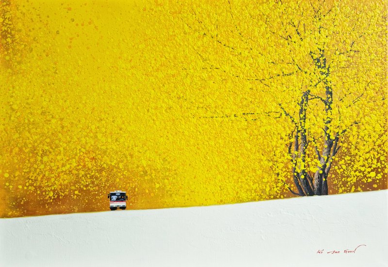 유년 시절에 대한 기억은 시간이 지나면서 특별한 감정이 깃들게 됩니다. 한적한 길에 부는 따스한 바람 흩날리는 꽃잎, 바람에 일렁이는 수풀, 하늘에 닿을 듯한 미루나무. 눈을 감으면 떠오르는 어딘가 흐릿하고 동시에 선명한 기억들은 가슴을 아리게 합니다. 기억에 깃든 이 감정은 바로 그리움입니다. 고재군 작가는 그리움을 그립니다. 작품들 속 완행버스는 아스라한 기억 속을 정처 없이 달립니다. 특정한 정류장 없이 기다리는 사람이 있으면 태우고 가는 완행버스처럼 그리움은 기억의 장면 장면에서 잠시 멈춰 서서 과거를 돌아보게 합니다. 그 짧은 시간 동안 우리의 가슴은 추억 속의 행복으로 가득 차게 됩니다. 고재군 작가의 작품을 통해 그리움이 이끄는 곳으로 행복한 추억 속으로의 여행을 떠나 보시기 바랍니다.