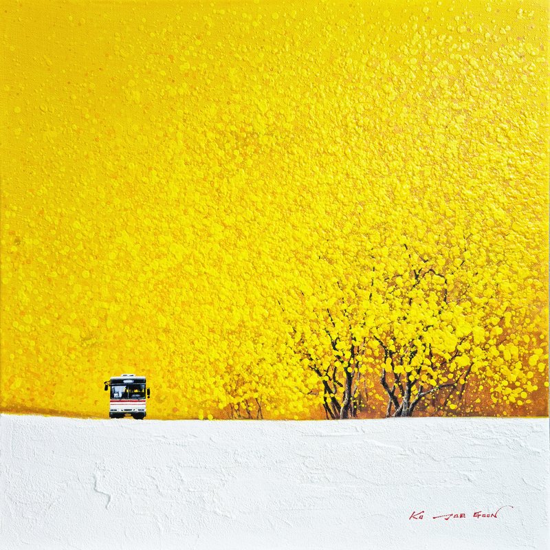 유년 시절에 대한 기억은 시간이 지나면서 특별한 감정이 깃들게 됩니다. 한적한 길에 부는 따스한 바람 흩날리는 꽃잎, 바람에 일렁이는 수풀, 하늘에 닿을 듯한 미루나무. 눈을 감으면 떠오르는 어딘가 흐릿하고 동시에 선명한 기억들은 가슴을 아리게 합니다. 기억에 깃든 이 감정은 바로 그리움입니다. 고재군 작가는 그리움을 그립니다. 작품들 속 완행버스는 아스라한 기억 속을 정처 없이 달립니다. 특정한 정류장 없이 기다리는 사람이 있으면 태우고 가는 완행버스처럼 그리움은 기억의 장면 장면에서 잠시 멈춰 서서 과거를 돌아보게 합니다. 그 짧은 시간 동안 우리의 가슴은 추억 속의 행복으로 가득 차게 됩니다. 고재군 작가의 작품을 통해 그리움이 이끄는 곳으로 행복한 추억 속으로의 여행을 떠나 보시기 바랍니다.