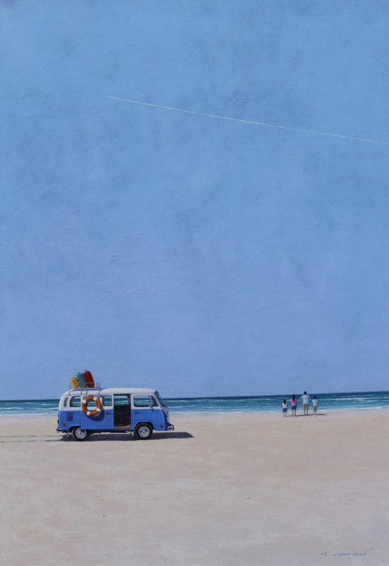 유년 시절에 대한 기억은 시간이 지나면서 특별한 감정이 깃들게 됩니다. 한적한 길에 부는 따스한 바람 흩날리는 꽃잎, 바람에 일렁이는 수풀, 하늘에 닿을 듯한 미루나무. 눈을 감으면 떠오르는 어딘가 흐릿하고 동시에 선명한 기억들은 가슴을 아리게 합니다. 기억에 깃든 이 감정은 바로 그리움입니다. 고재군 작가는 그리움을 그립니다. 작품들 속 완행버스는 아스라한 기억 속을 정처 없이 달립니다. 특정한 정류장 없이 기다리는 사람이 있으면 태우고 가는 완행버스처럼 그리움은 기억의 장면 장면에서 잠시 멈춰 서서 과거를 돌아보게 합니다. 그 짧은 시간 동안 우리의 가슴은 추억 속의 행복으로 가득 차게 됩니다. 고재군 작가의 작품을 통해 그리움이 이끄는 곳으로 행복한 추억 속으로의 여행을 떠나 보시기 바랍니다.