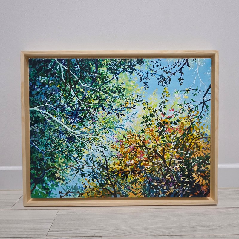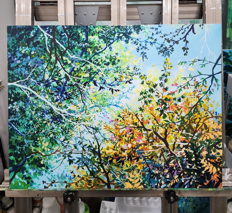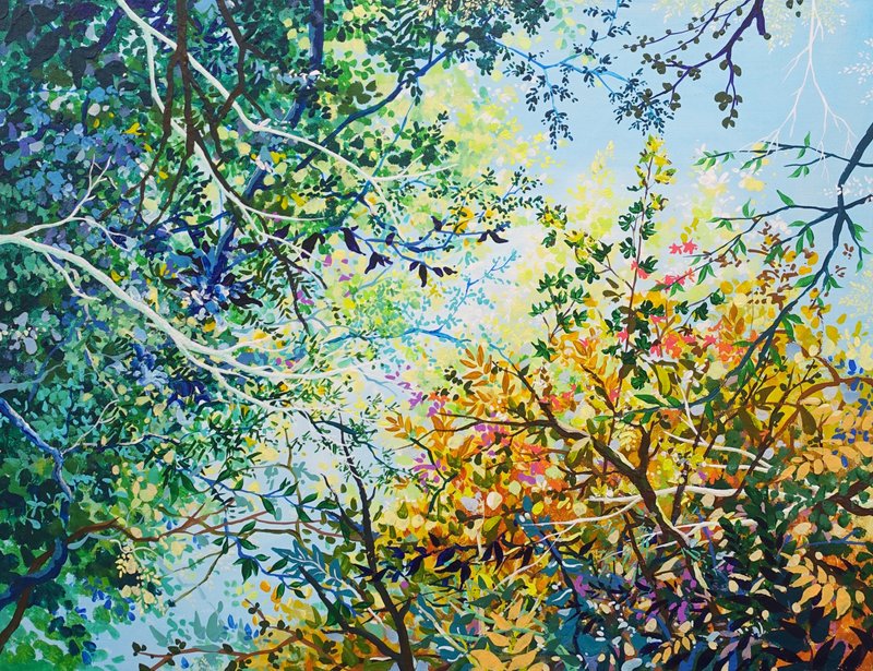 우리에게 숲은 그다지 멀리 있는 존재가 아닙니다. 홀로 사색하고 싶을 때나 휴식을 취하고 싶을 때, 현실에서 잠시 피해 있고 싶을 때 찾는 곳이 바로 숲입니다. 정지희 작가가 그려낸 숲은 우리가 익숙하게 보아온 것과는 어딘가 거리가 있어 보입니다. 빽빽하게 우거진 나무들은 단순히 녹색이라고 표현하기에는 보라색, 주황색, 파란색 등 형형색색을 띠며 다채로운 모습을 하고 있습니다. 이국적이고도 신비로운 그림은 도시의 바쁜 일상을 살아가는 현대인들이 좀처럼 느껴보기 힘든 청량감을 줍니다. 정지희 작가의 그림을 통해 잠시나마 반복적인 현실로부터 떨어져 신비의 공간 안을 산책하는 시간을 가져볼 수 있기를 기대합니다.