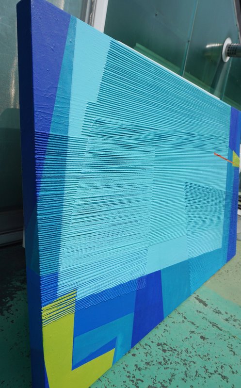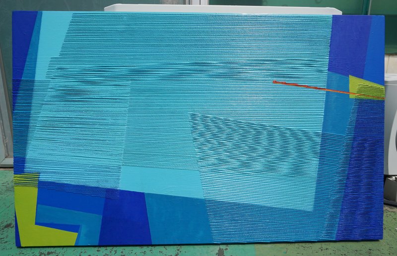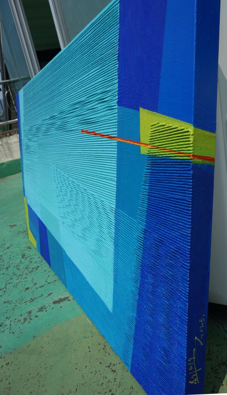 보고 있으면 마음이 차분히 정돈되고 편안해지는 작품입니다. 하나하나 이어 붙인 실은 똑바르게 정렬되어 있지는 않지만 그래서인지 오히려 기계적이고 차갑기보다는 인간적이고 따스하게 느껴집니다. 이 실들은 작품의 질감(texture)을 풍성하게 하며 보는 이들에게 촉각적인 감각을 일깨우기도 합니다. 여러 가지 색과 재료들로 구현된 사각형, 나무, 나팔꽃, 흰 도자기를 비롯한 다양한 소재들은 감상자들의 감각을 일깨우고자 고안된 것입니다. 인간미는 고사하고 자신의 감정을 추스를 시간도 없이 바쁘게 살아가는 이들에게 작가는 자신의 감각과 감정에 오롯이 집중할 시간을 갖길 제안합니다. 작품의 질감과 작품 속 형태들이 서로 관계를 맺는 양상에 주목하면서 내면의 감각을 깨워보는 시간을 가져보시기를 바랍니다.