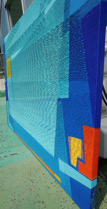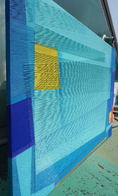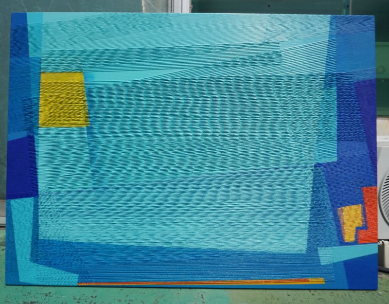 보고 있으면 마음이 차분히 정돈되고 편안해지는 작품입니다. 하나하나 이어 붙인 실은 똑바르게 정렬되어 있지는 않지만 그래서인지 오히려 기계적이고 차갑기보다는 인간적이고 따스하게 느껴집니다. 이 실들은 작품의 질감(texture)을 풍성하게 하며 보는 이들에게 촉각적인 감각을 일깨우기도 합니다. 여러 가지 색과 재료들로 구현된 사각형, 나무, 나팔꽃, 흰 도자기를 비롯한 다양한 소재들은 감상자들의 감각을 일깨우고자 고안된 것입니다. 인간미는 고사하고 자신의 감정을 추스를 시간도 없이 바쁘게 살아가는 이들에게 작가는 자신의 감각과 감정에 오롯이 집중할 시간을 갖길 제안합니다. 작품의 질감과 작품 속 형태들이 서로 관계를 맺는 양상에 주목하면서 내면의 감각을 깨워보는 시간을 가져보시기를 바랍니다.
