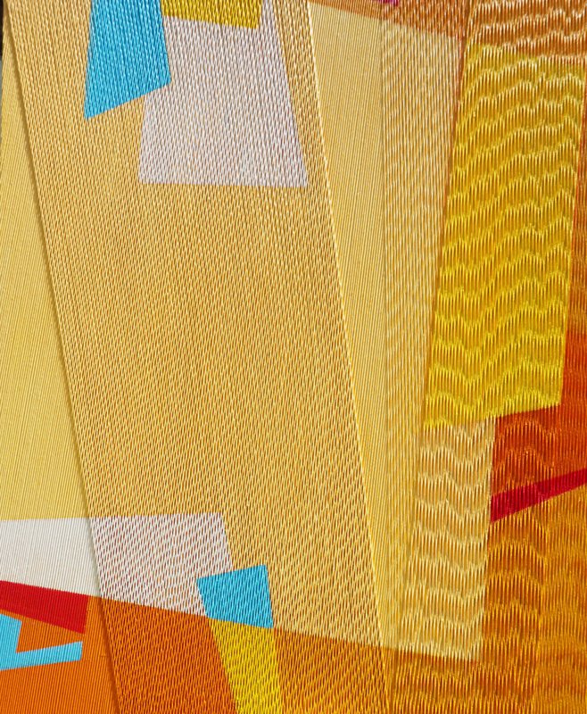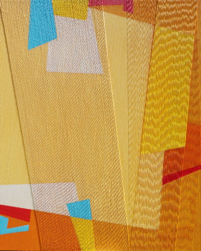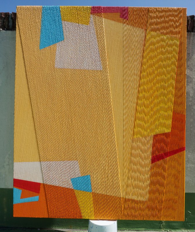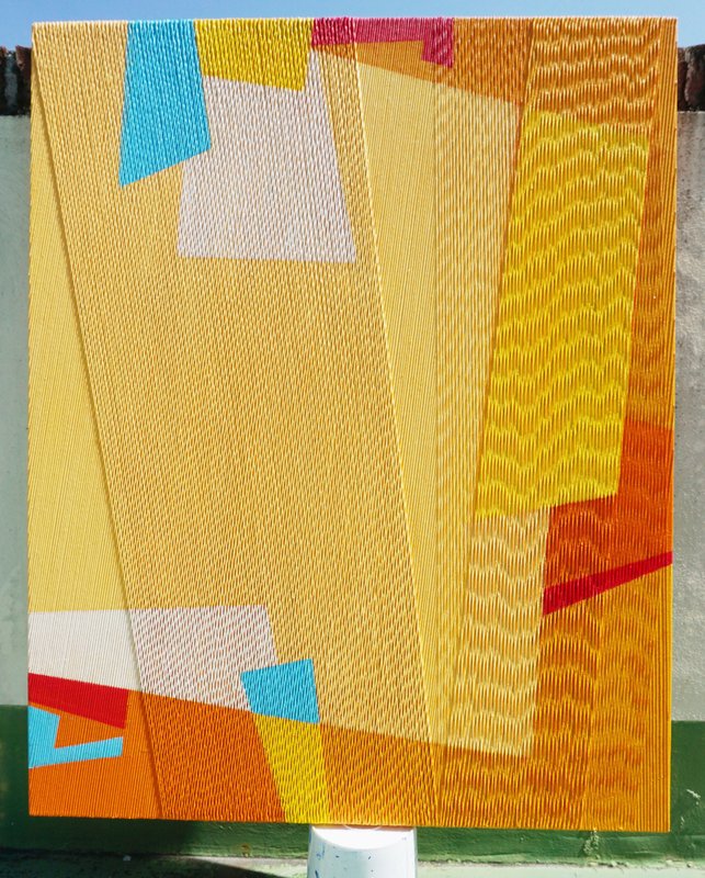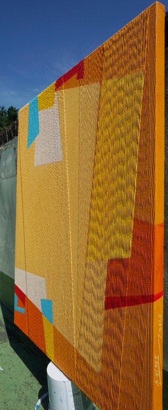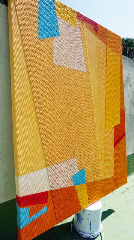 보고 있으면 마음이 차분히 정돈되고 편안해지는 작품입니다. 하나하나 이어 붙인 실은 똑바르게 정렬되어 있지는 않지만 그래서인지 오히려 기계적이고 차갑기보다는 인간적이고 따스하게 느껴집니다. 이 실들은 작품의 질감(texture)을 풍성하게 하며 보는 이들에게 촉각적인 감각을 일깨우기도 합니다. 여러 가지 색과 재료들로 구현된 사각형, 나무, 나팔꽃, 흰 도자기를 비롯한 다양한 소재들은 감상자들의 감각을 일깨우고자 고안된 것입니다. 인간미는 고사하고 자신의 감정을 추스를 시간도 없이 바쁘게 살아가는 이들에게 작가는 자신의 감각과 감정에 오롯이 집중할 시간을 갖길 제안합니다. 작품의 질감과 작품 속 형태들이 서로 관계를 맺는 양상에 주목하면서 내면의 감각을 깨워보는 시간을 가져보시기를 바랍니다.