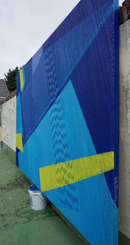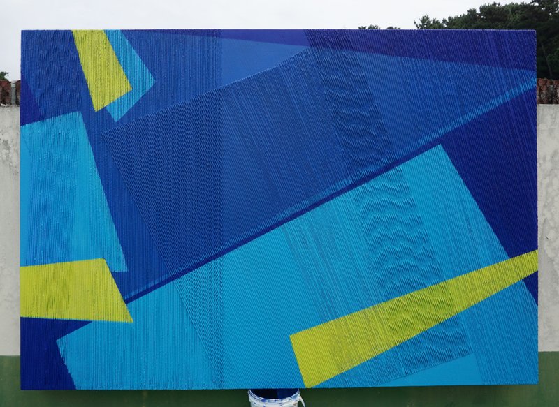 보고 있으면 마음이 차분히 정돈되고 편안해지는 작품입니다. 하나하나 이어 붙인 실은 똑바르게 정렬되어 있지는 않지만 그래서인지 오히려 기계적이고 차갑기보다는 인간적이고 따스하게 느껴집니다. 이 실들은 작품의 질감(texture)을 풍성하게 하며 보는 이들에게 촉각적인 감각을 일깨우기도 합니다. 여러 가지 색과 재료들로 구현된 사각형, 나무, 나팔꽃, 흰 도자기를 비롯한 다양한 소재들은 감상자들의 감각을 일깨우고자 고안된 것입니다. 인간미는 고사하고 자신의 감정을 추스를 시간도 없이 바쁘게 살아가는 이들에게 작가는 자신의 감각과 감정에 오롯이 집중할 시간을 갖길 제안합니다. 작품의 질감과 작품 속 형태들이 서로 관계를 맺는 양상에 주목하면서 내면의 감각을 깨워보는 시간을 가져보시기를 바랍니다.