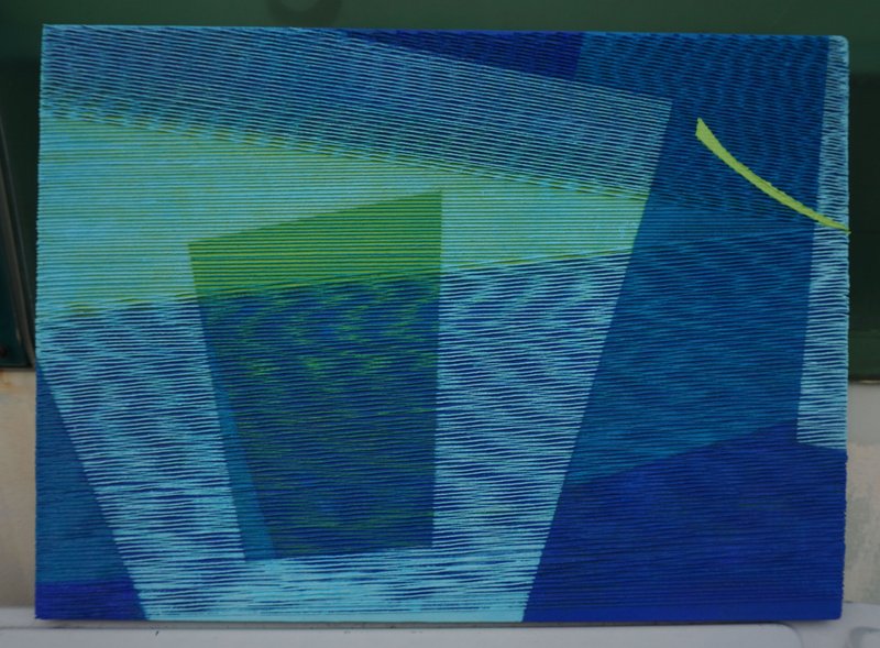 보고 있으면 마음이 차분히 정돈되고 편안해지는 작품입니다. 하나하나 이어 붙인 실은 똑바르게 정렬되어 있지는 않지만 그래서인지 오히려 기계적이고 차갑기보다는 인간적이고 따스하게 느껴집니다. 이 실들은 작품의 질감(texture)을 풍성하게 하며 보는 이들에게 촉각적인 감각을 일깨우기도 합니다. 여러 가지 색과 재료들로 구현된 사각형, 나무, 나팔꽃, 흰 도자기를 비롯한 다양한 소재들은 감상자들의 감각을 일깨우고자 고안된 것입니다. 인간미는 고사하고 자신의 감정을 추스를 시간도 없이 바쁘게 살아가는 이들에게 작가는 자신의 감각과 감정에 오롯이 집중할 시간을 갖길 제안합니다. 작품의 질감과 작품 속 형태들이 서로 관계를 맺는 양상에 주목하면서 내면의 감각을 깨워보는 시간을 가져보시기를 바랍니다.